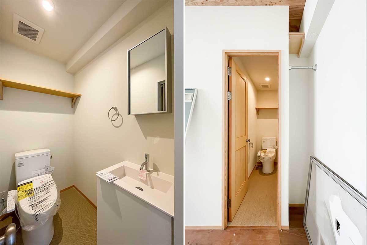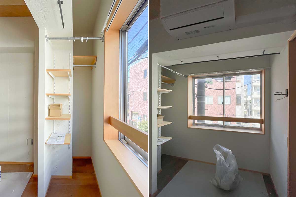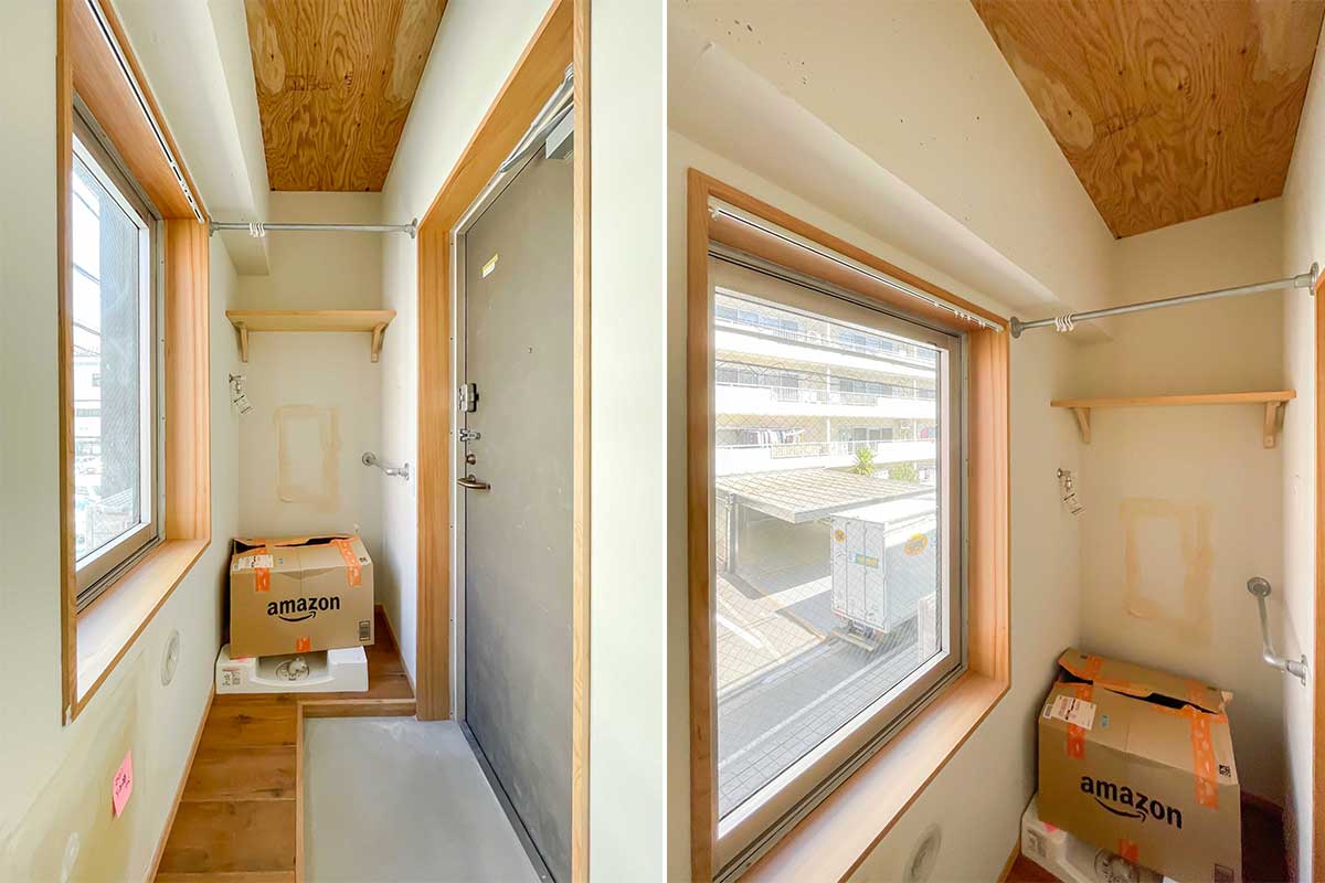 収納は窓辺・洗面所入口横の2箇所、部屋の隅に設けられており、窓辺の方はカーテンポール付きで隠すこともできます。