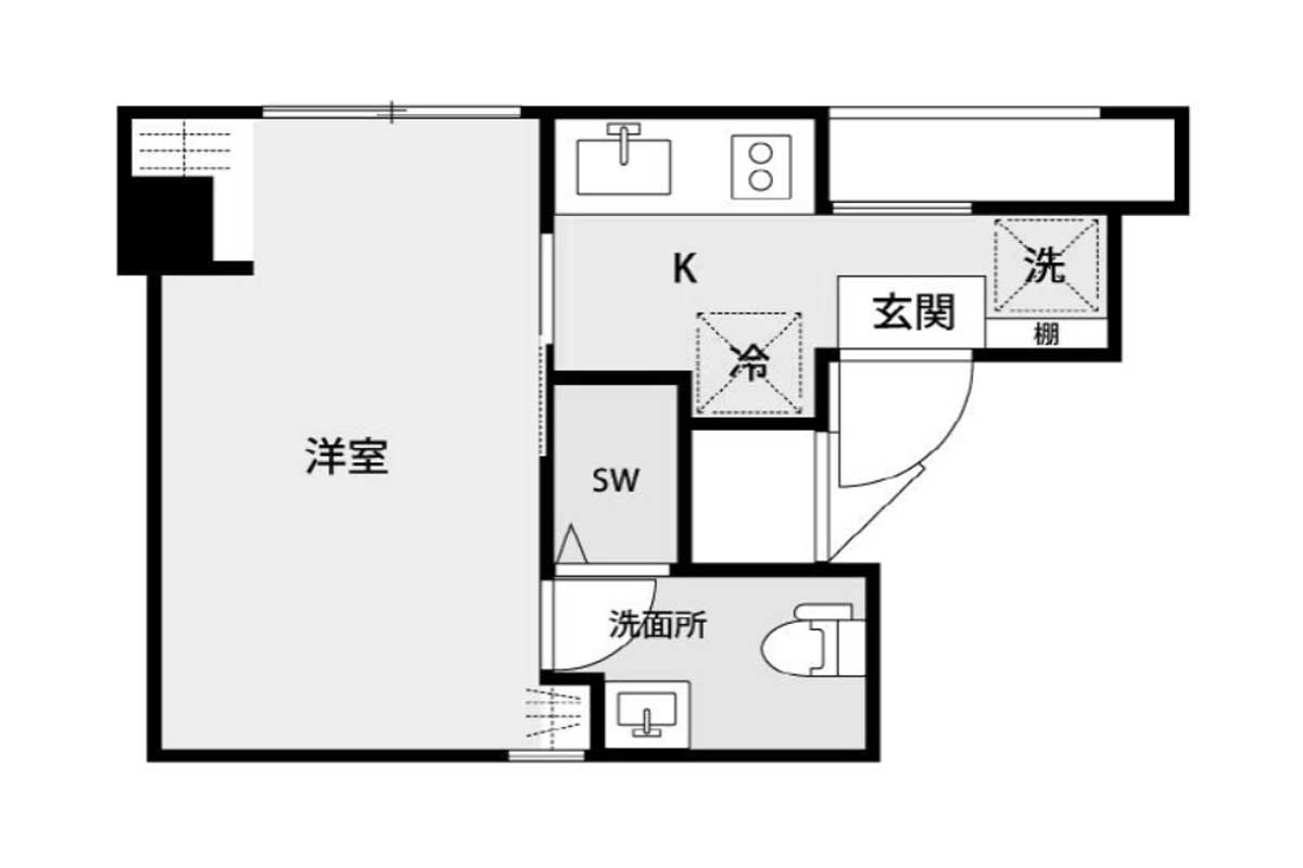 玄関 → 廊下にキッチン → お部屋という、よくある1Kの動線ですが、玄関入ってすぐに窓があるので明るい◎