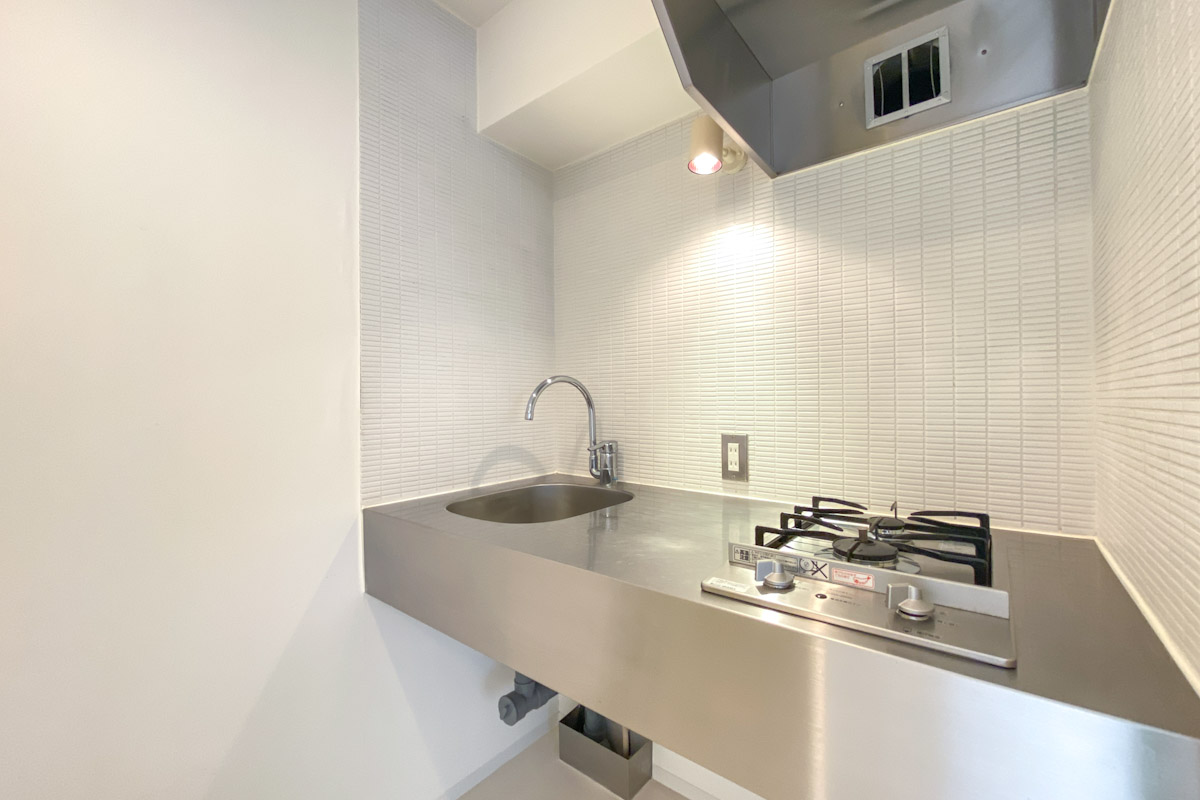 また、浴槽はなくシャワーのみ、キッチンはステンレスとスタイリッシュなお部屋で、