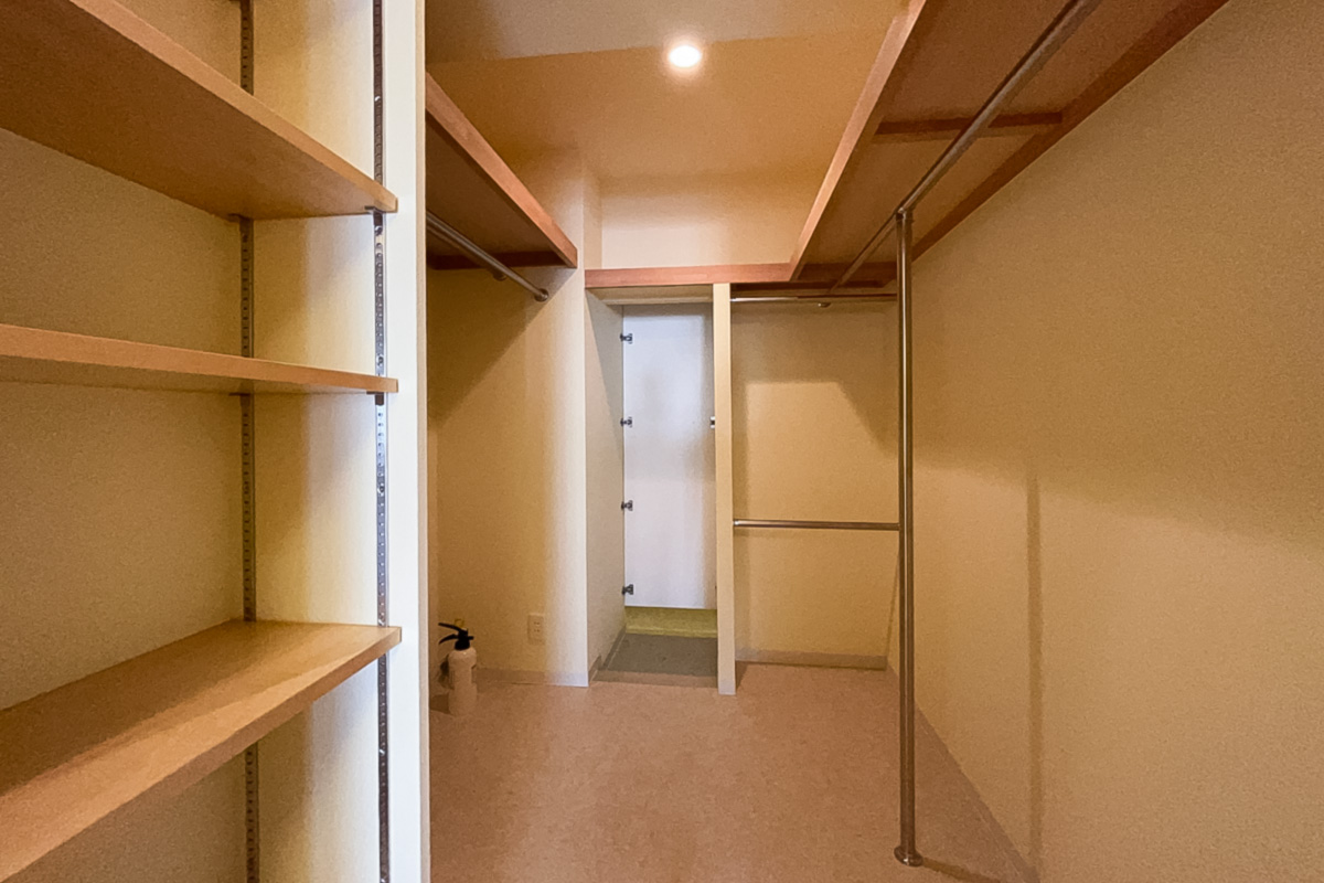 また玄関を入ってすぐ右に姿見があるのですが、なんと開閉式。ウォークインクローゼットにここから入ることも可能です。広々としたウォークインクローゼットは洋室と繋がっているので、着替えを済ませてそのまま玄関に出てくることもできる、なんとも便利な間取にリノベーションされています。