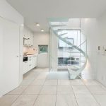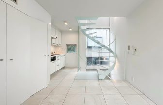 玄関を開けて中へ入ると、まずは右側にIHコンロの広々としたキッチンが。そして左側に浴室があります。