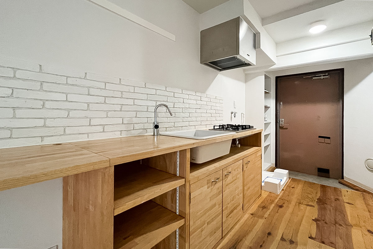 キッチンから一続きに設けられた木のカウンターテーブル兼収納棚は、料理の作業台、ダイニングテーブル、リモートワークスペースなど何役にも化けてくれる便利さ。