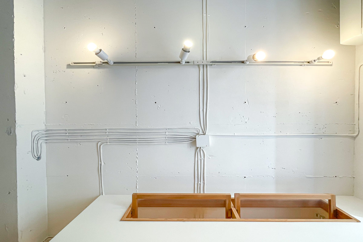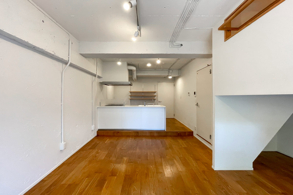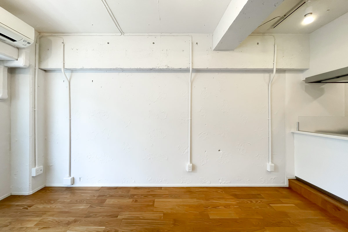 また白色に塗装された壁と無垢のフローリングが優しく落ち着く空間です。天井に配線が見えるのもポイント◎