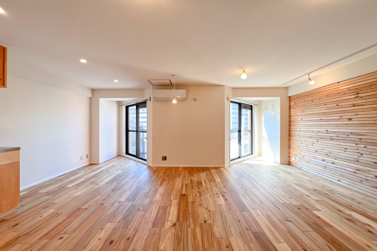 お部屋は5階部分、2020年にフルリノベーション済み。こだわりのインテリアは建具は渋柿塗装。自然塗料であること以外に経年とともに色に味わい深くなっていく経過を楽しむことが出来ます。
