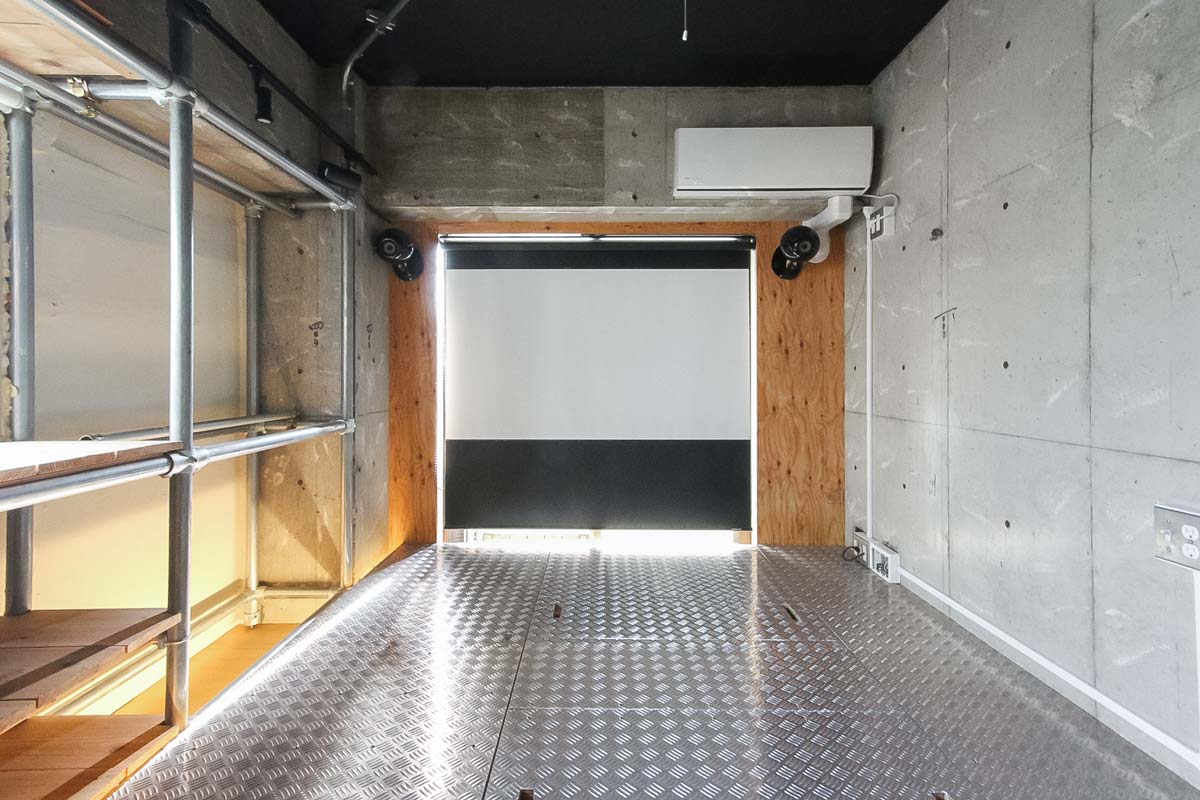 鉄の単管を組んで製作した棚、チェッカープレートを室内の至るところに使用することで、武骨で荒々しさがあります。