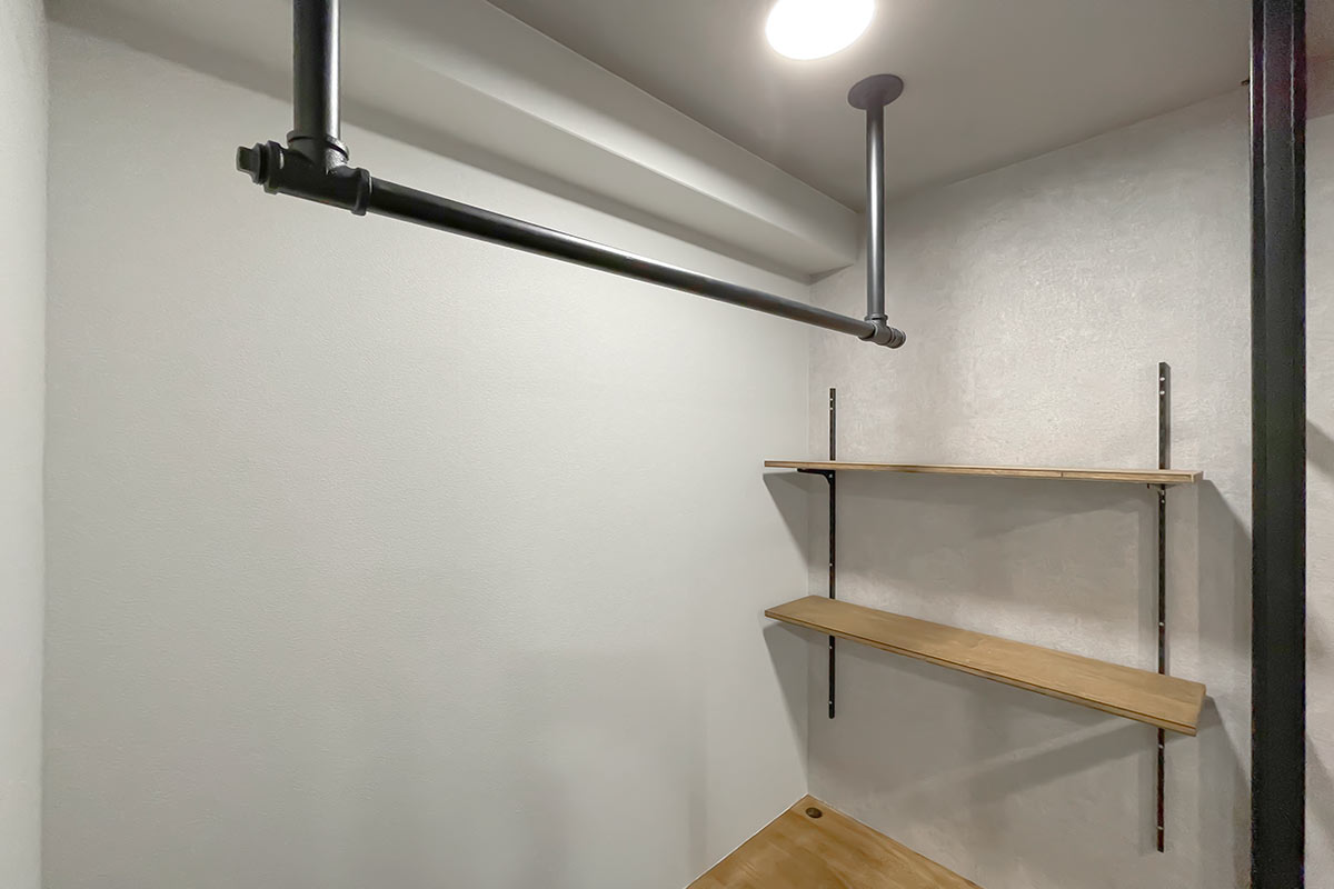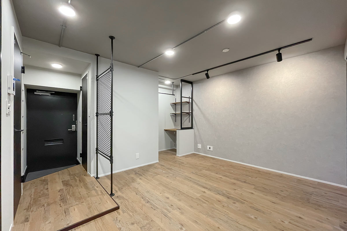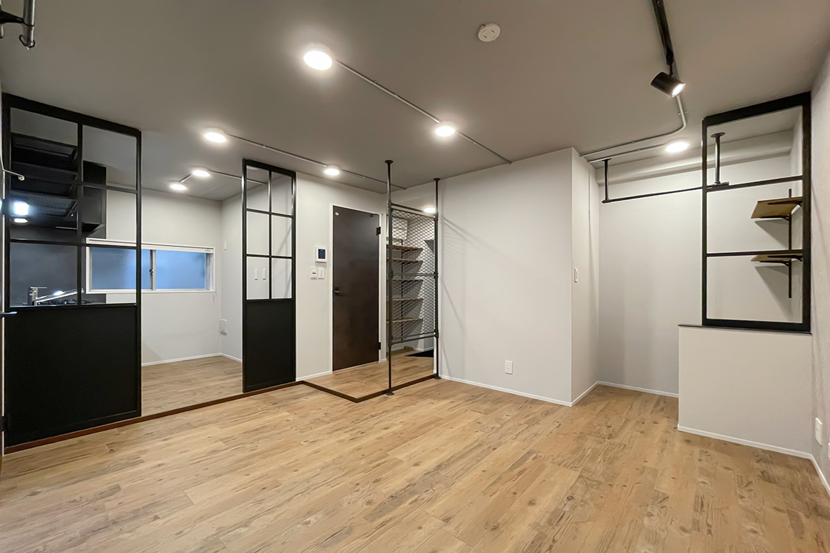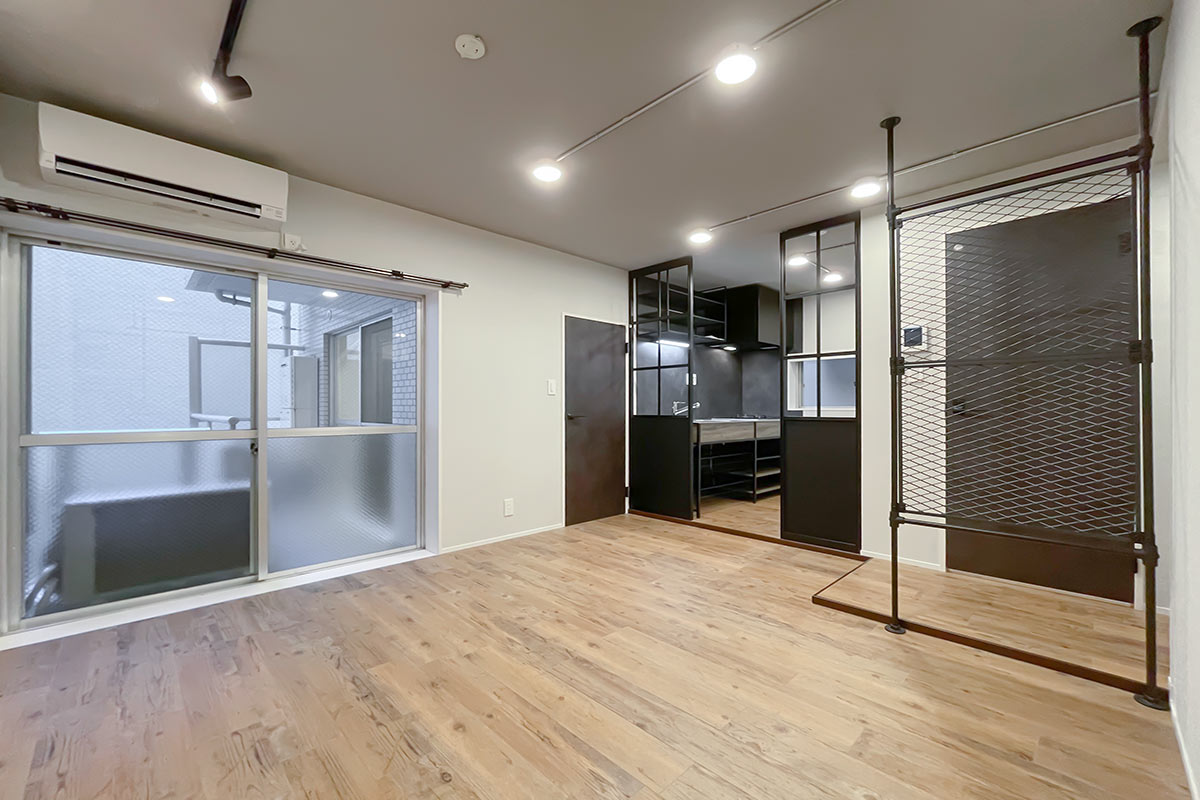 金属×木目の組み合わせによって、武骨さと温かみを兼ね備えた部屋にリノベーション。