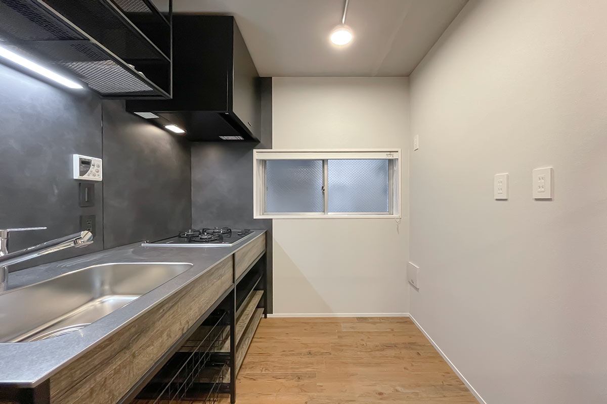 キッチンは3口コンロで、黒のアイアンが効いたデザインで料理も捗りそう。キッチン横に窓があることもポイントです◎