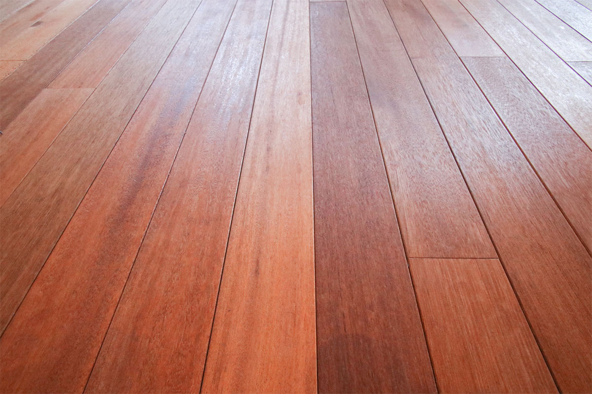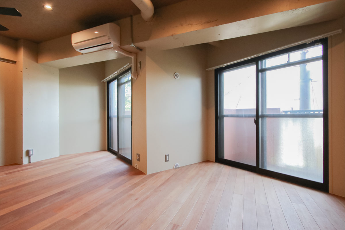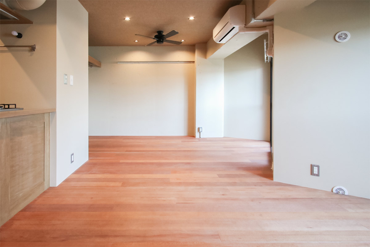 まるでウッドデッキのような、赤みがかった色味の異なる組み合わせの無垢床がこのお部屋の印象を温かみのあるものにしています。観葉植物やチーク材などの木製家具といったインテリアもよく映えそう。