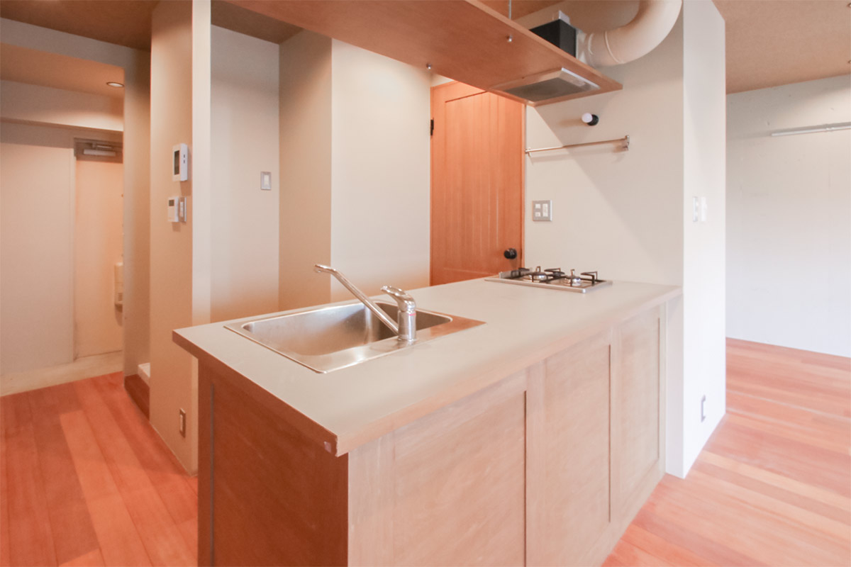 カウンター下には収納がないため、手持ちの物量にあわせて設置するのがよさそう。背面のくぼみが冷蔵庫スペースになっているので、居室スペースにはみ出さず、動線を確保できるのもうれしいですね。