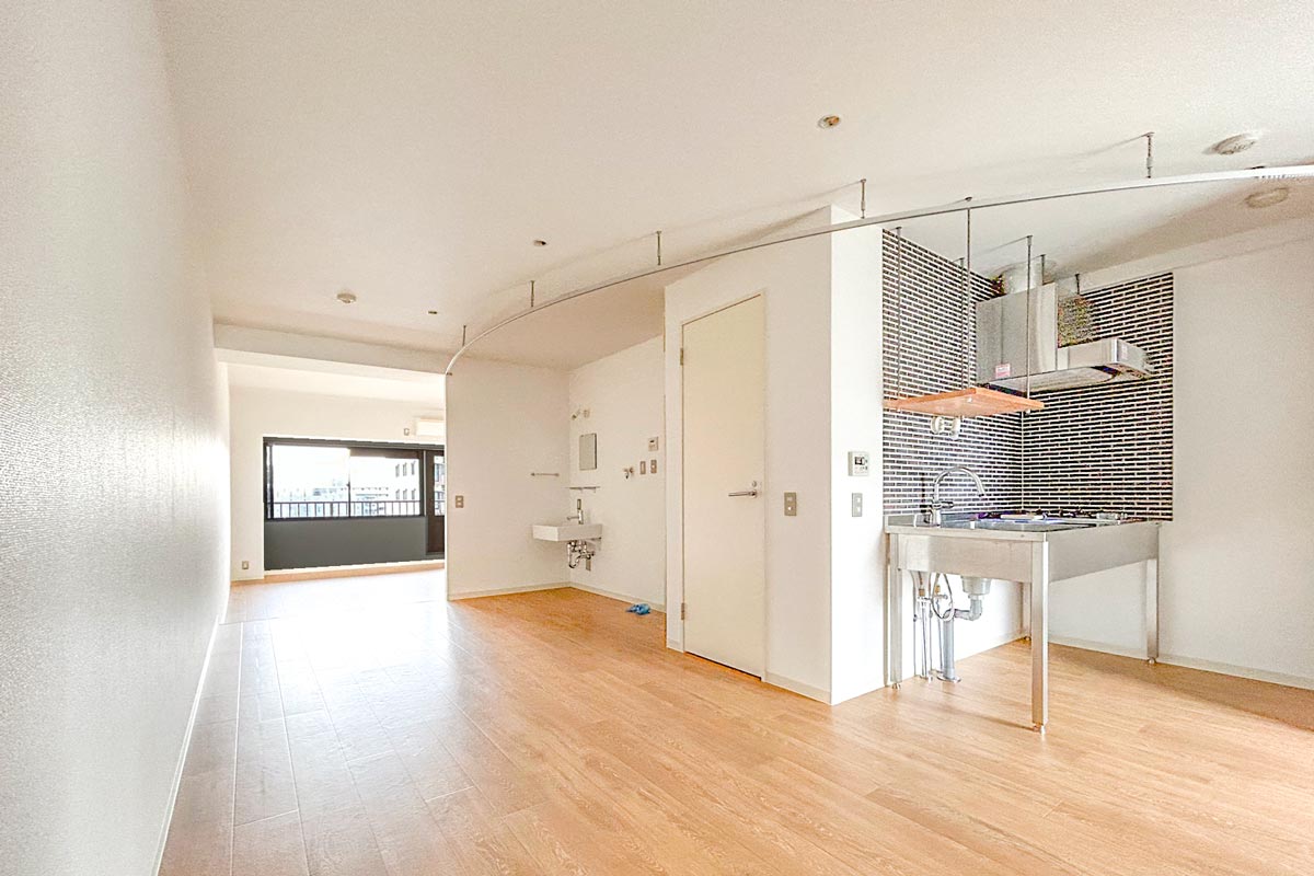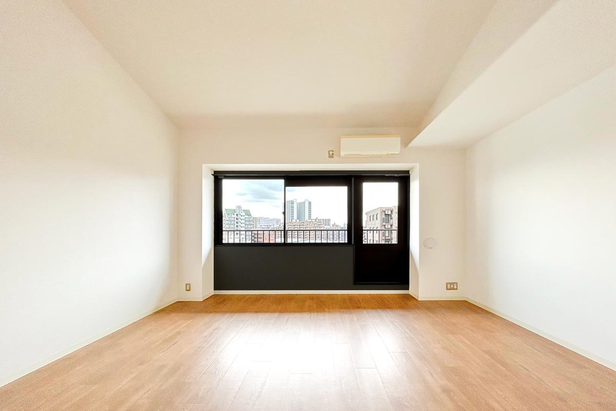 今回ご紹介するお部屋は角部屋の1LDKタイプ、最上階なので天井高が高くなっており開放感があります。