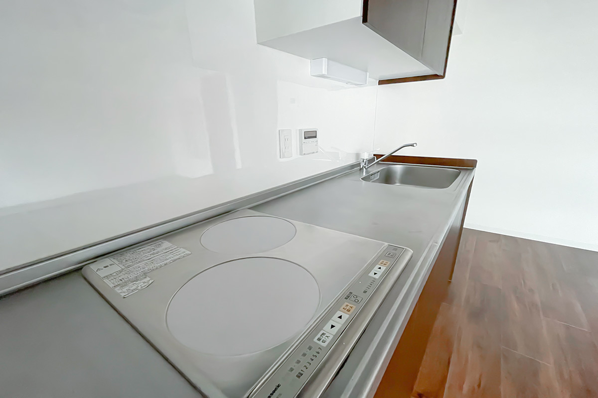 キッチンは部屋に馴染むブラウンの色合いで、2口IHコンロ。冷蔵庫を置いてもまだ余裕があるので、横にラックを置いて調理家電を収めることができます。