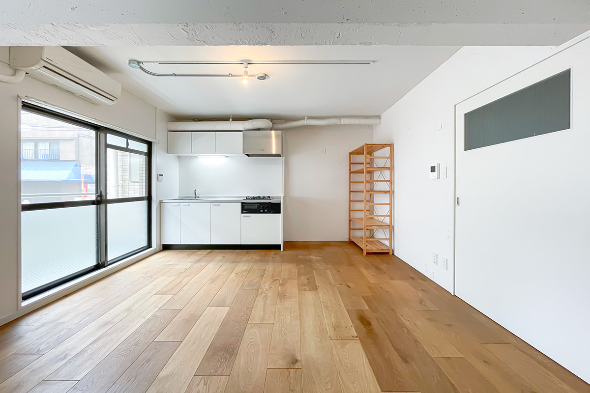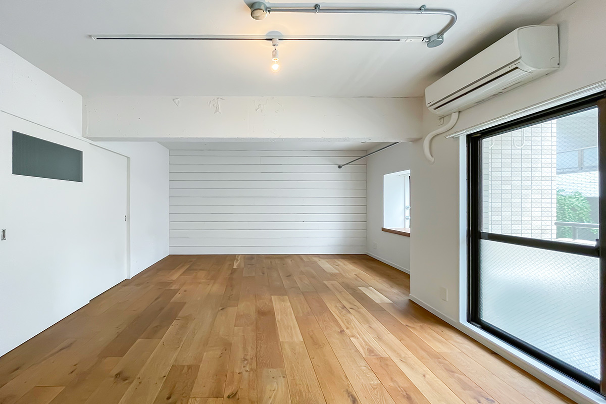 オークの無垢床や白塗装されたコンクリート壁、羽目板がカフェのような雰囲気を醸し出し、素材のぬくもり感じるリノベ物件のご紹介です。