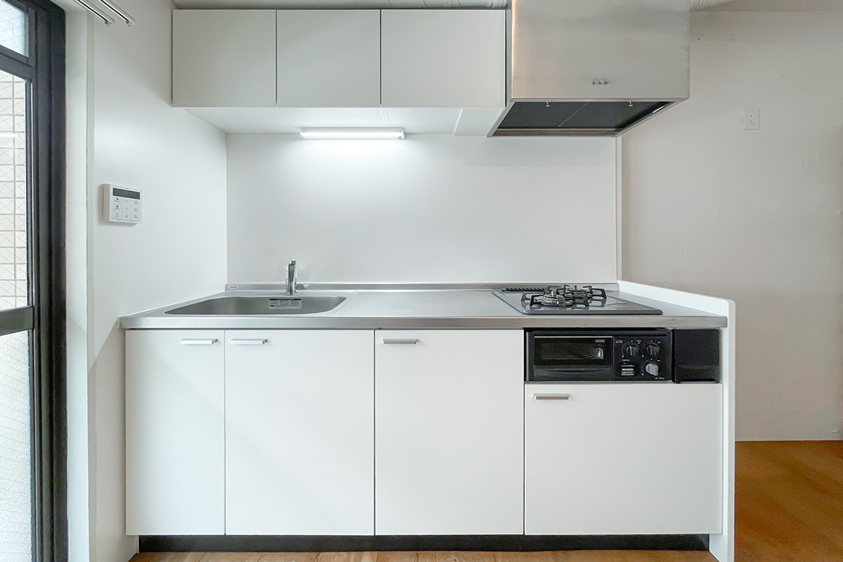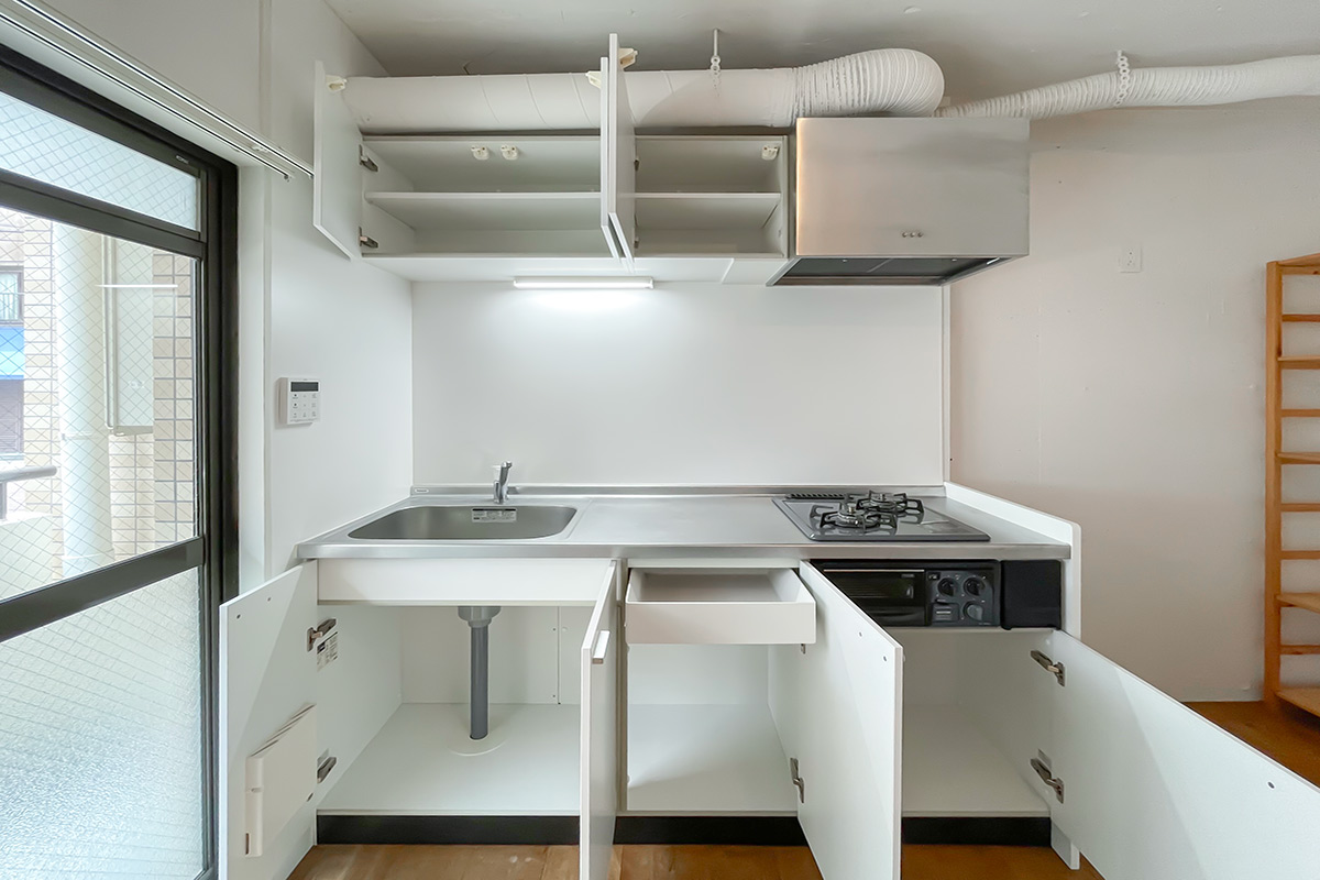 キッチンは2口コンロと上下に収納のあるシステムキッチンで、木製のシェルフが備え付け。置き場所は自由に移動できるので、壁に沿って配置するもよし、キッチン背面に持ってくることもできます。レンジやケトル、鍋やカトラリーを収納できます。
