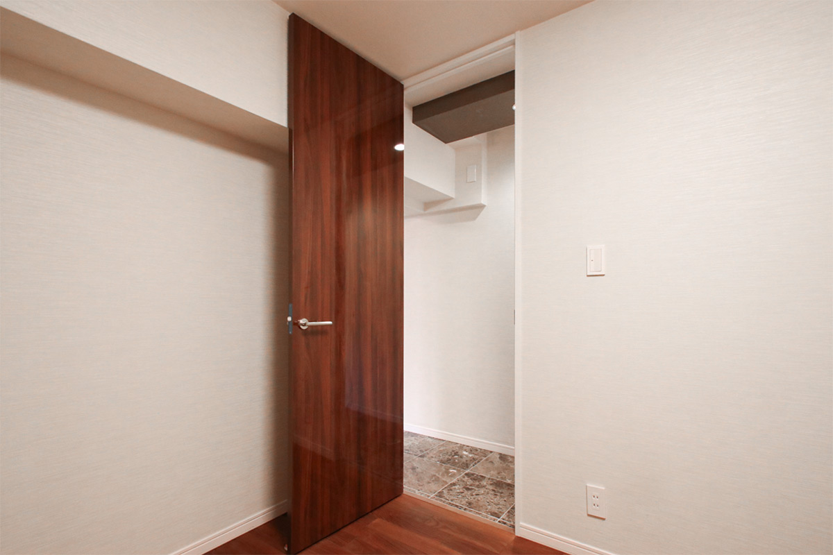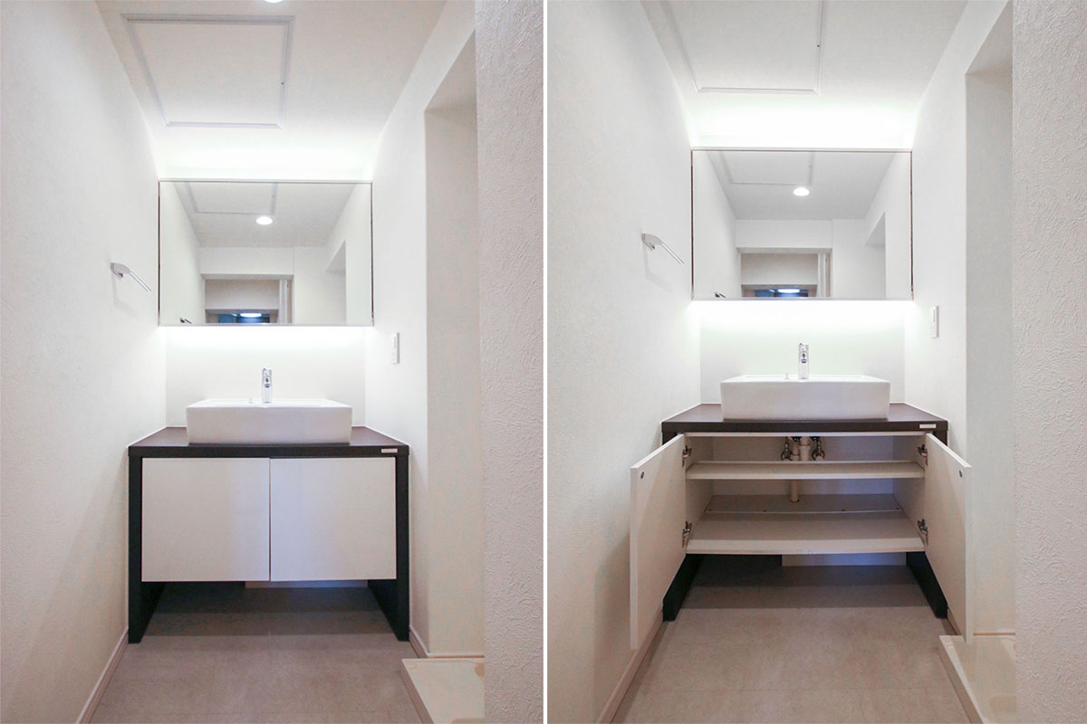 水回りは廊下沿いの扉内にあり、洗面スペースも広々としてホテルライクな仕様。