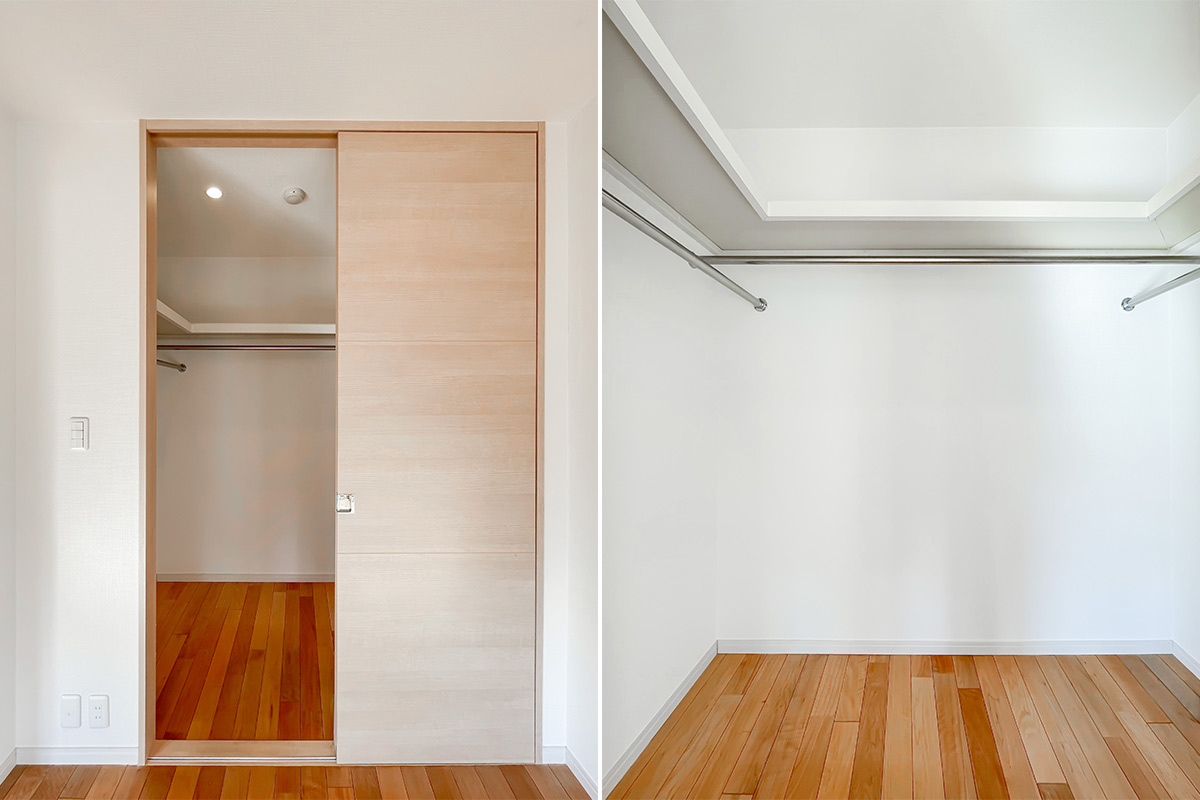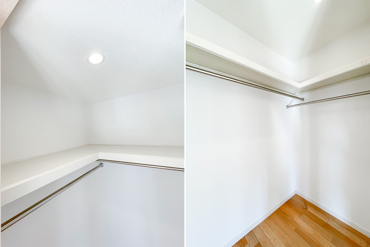 ウォークインクローゼットはコの字のハンガーパイプ付きで、たっぷりの容量。2人分も収まってくれそう。