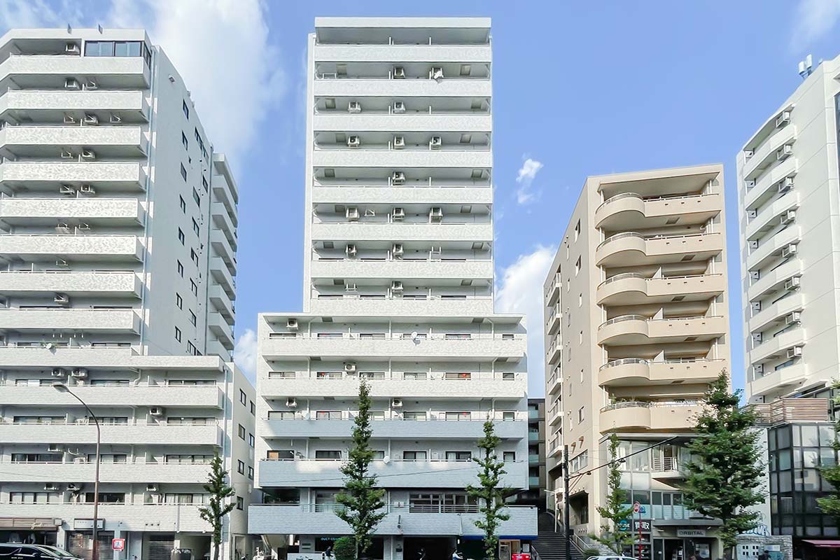 立地は代官山から歩いてわずか3分!鎗ヶ崎交差点すぐ目の前の白いタイルのヴィンテージマンション。1階には珈琲ショップやアイスクリーム専門店が入っています。