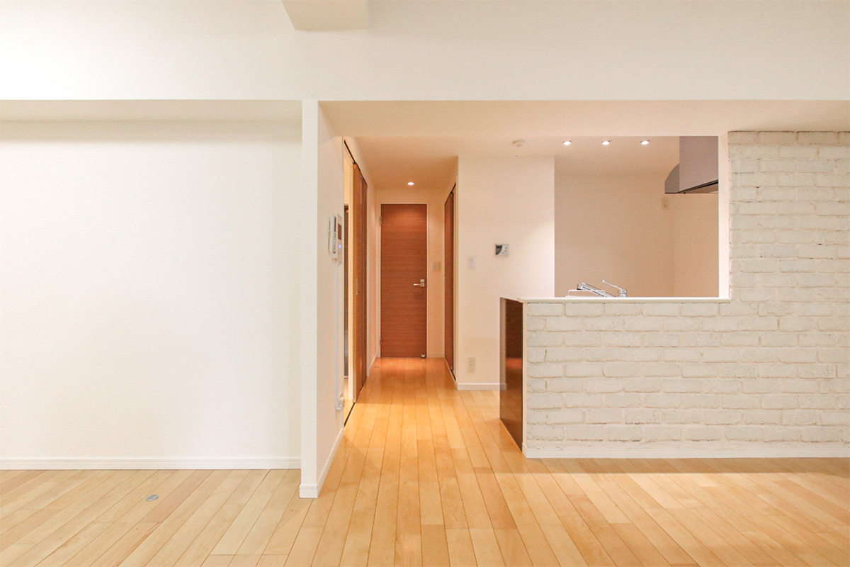 カウンターキッチンは白のレンガ風な仕立てがお部屋のポイントに。