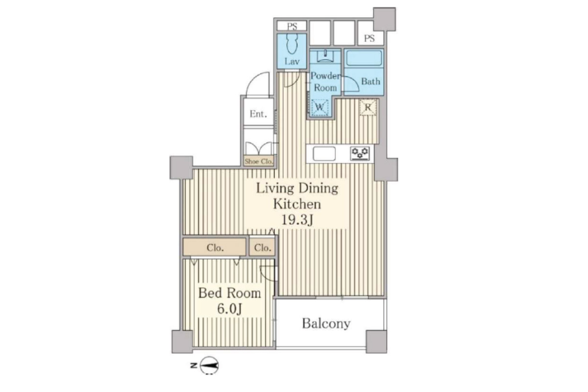 室内は55.69㎡、広々とした19.3帖のLDKに洋室6帖の1LDK。