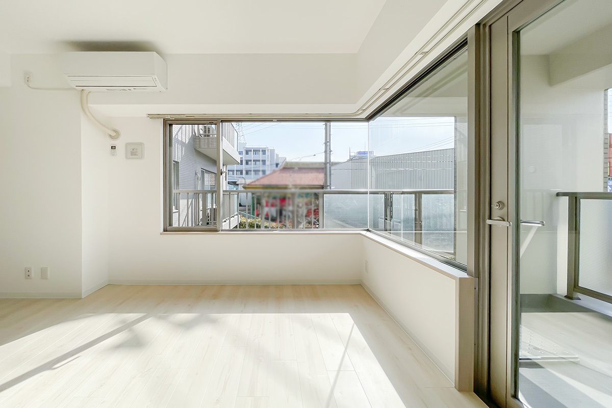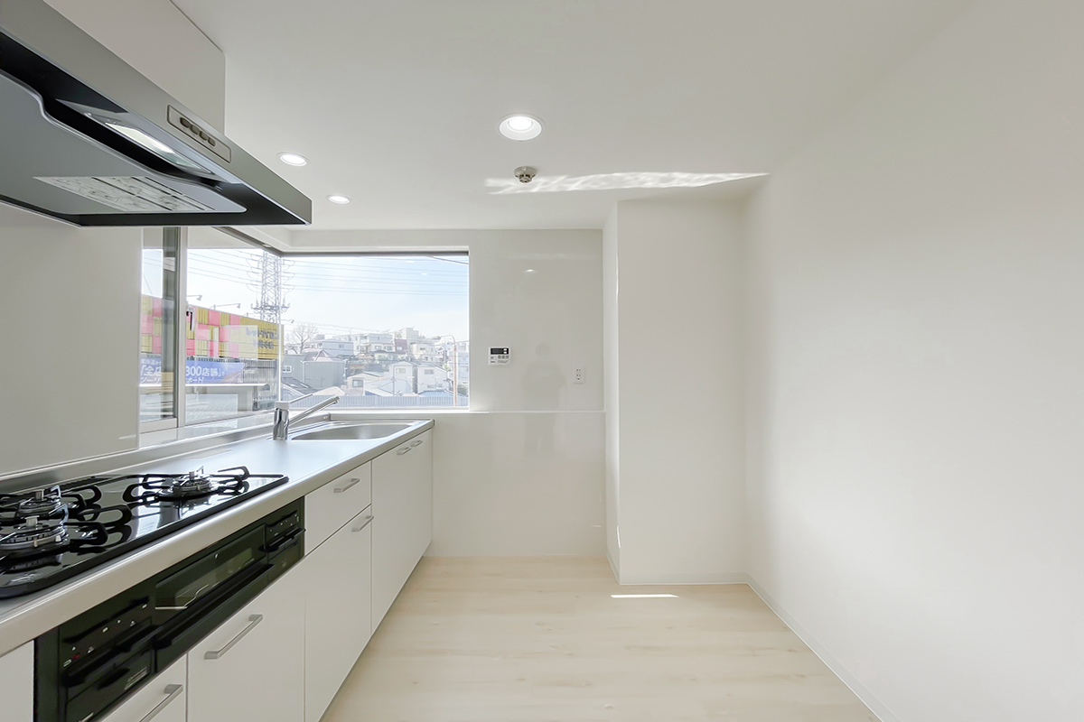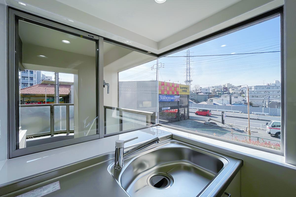 L字の窓ってなんだか心くすぐられます。景色が良く見えて、気持ちいいです◎このお部屋にはリビング・キッチンそれぞれにL字の窓。キッチンに立っていても気持ちよく料理ができそうです!