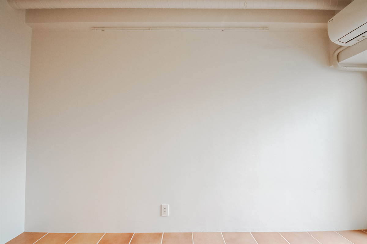 白壁にくりぬきのオープンラックに木製のテレビボード。