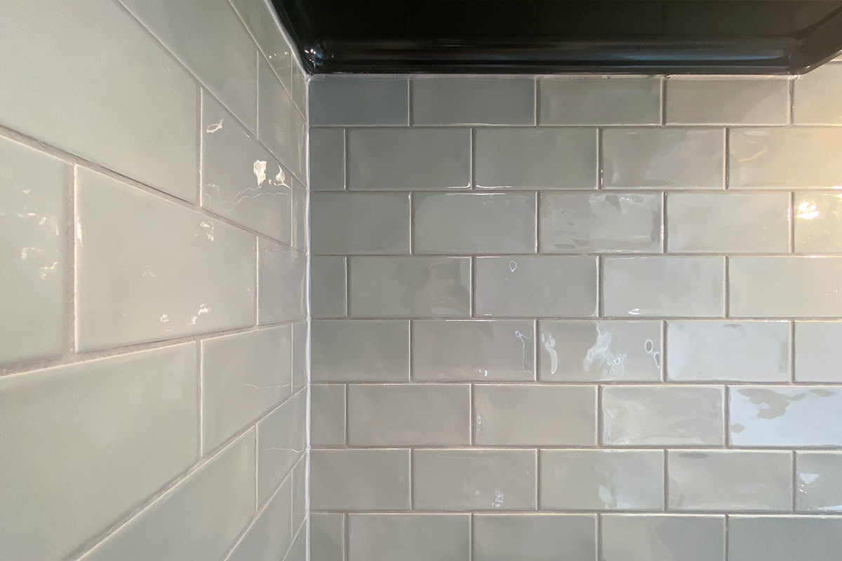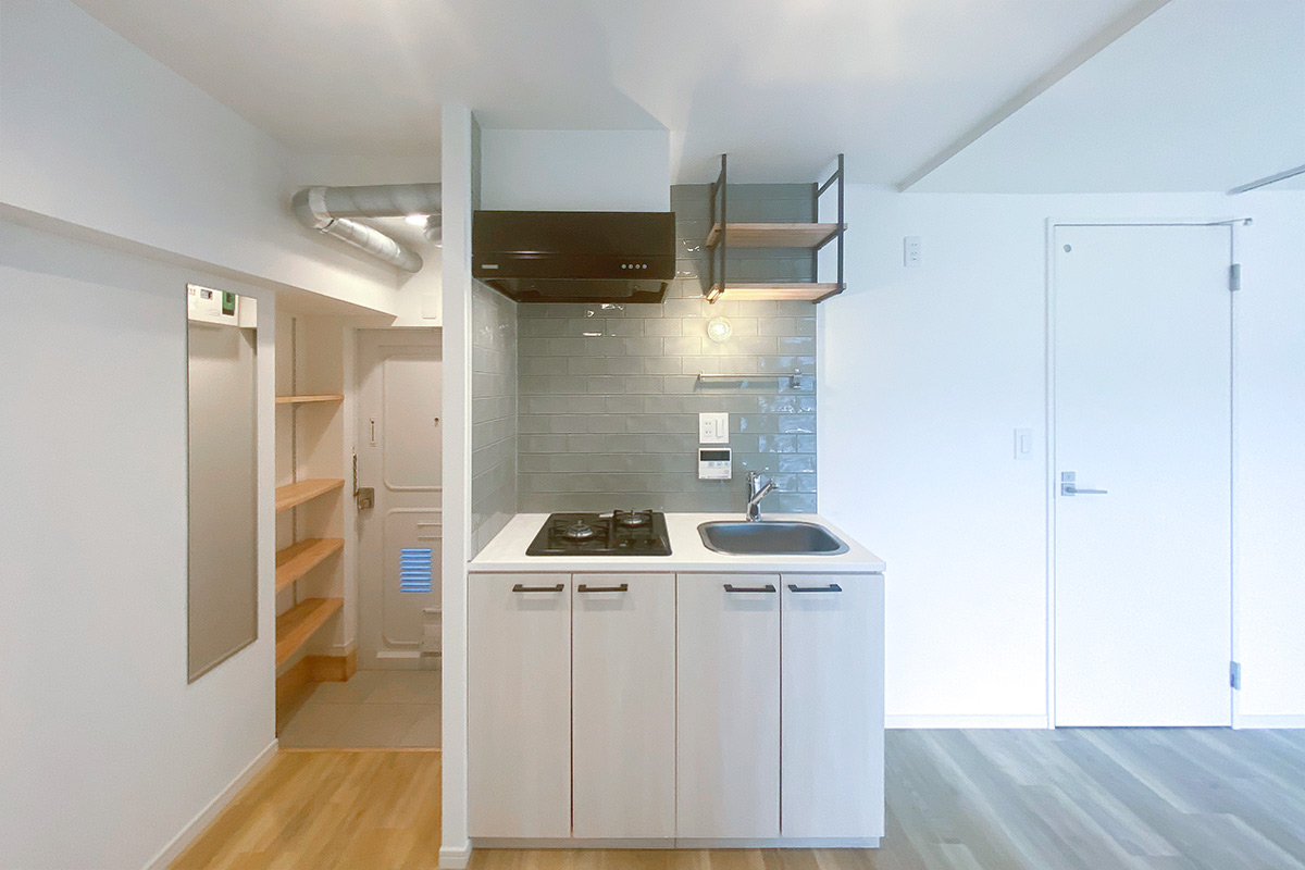 グレータイルの壁や木製棚をあしらったキッチンにはシンプルな2口ガスコンロ。