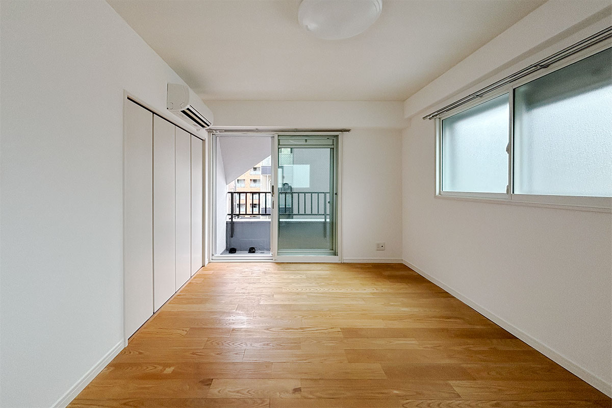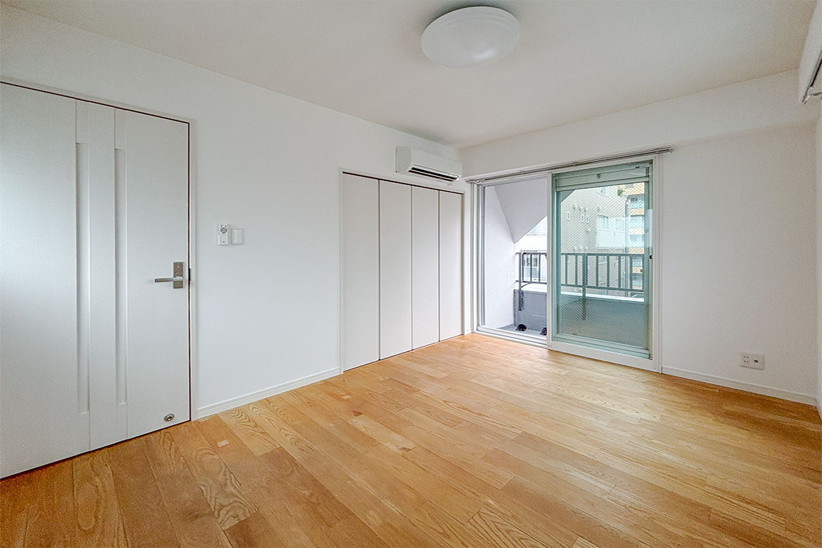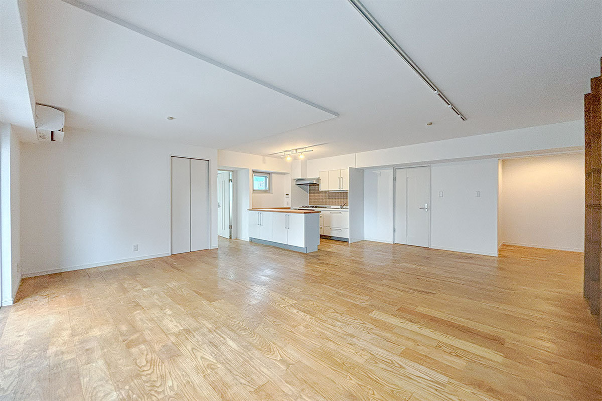 バルコニーからも光が差し込み、無垢材フローリングの暖かみを感じる空間です。