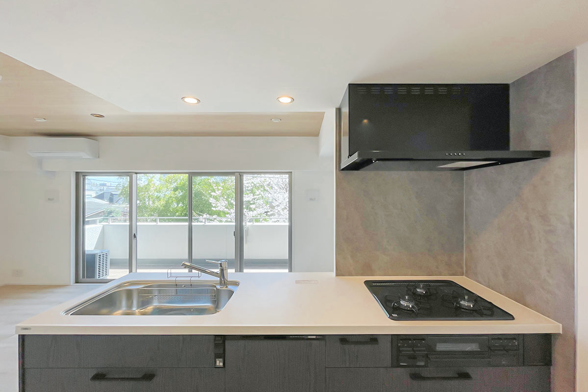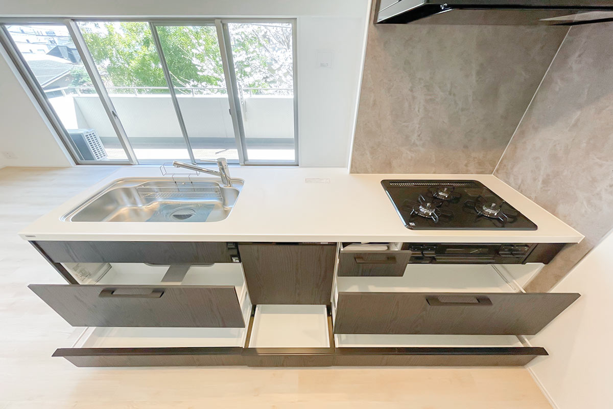 食洗機付き・収納スペースもたっぷりの機能美感じるカウンターキッチンも相まって、自然と家族全員がここに集まりたくなる、家族団らんのリビングダイニングです。