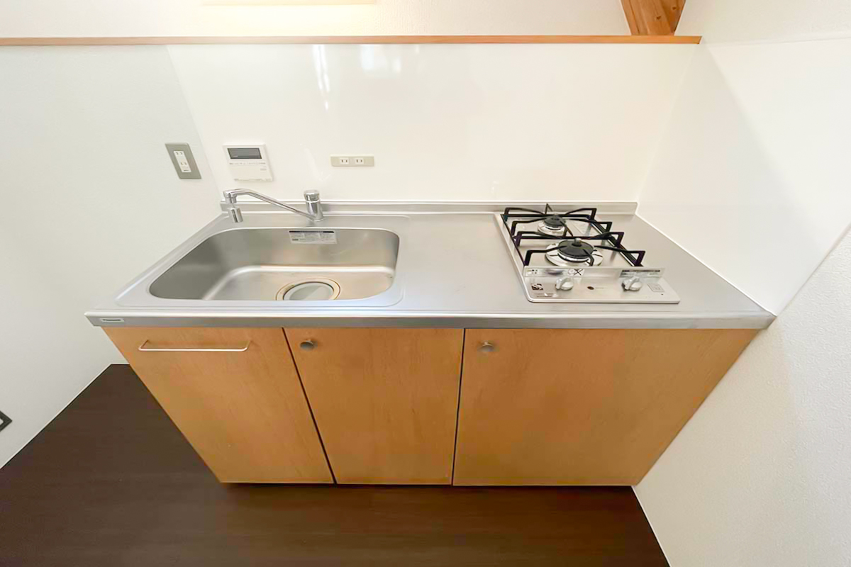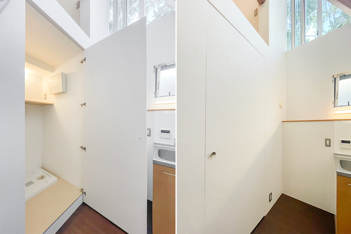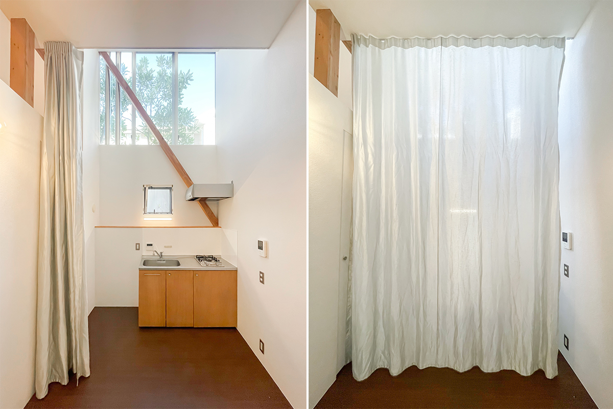 キッチン前にはカーテンレールが付いており、仕切って生活感を隠すこともできます。