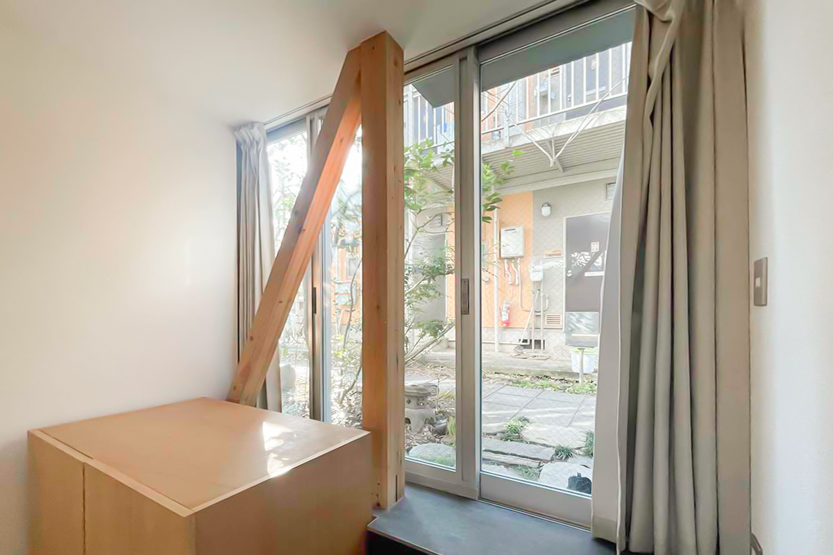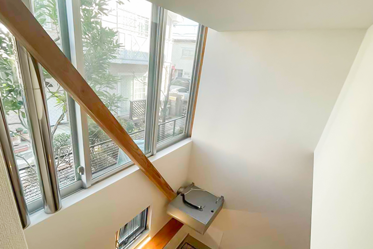 入口の階段脇から部屋の内部に至るまで、とにかく部屋一面に窓!な建物。