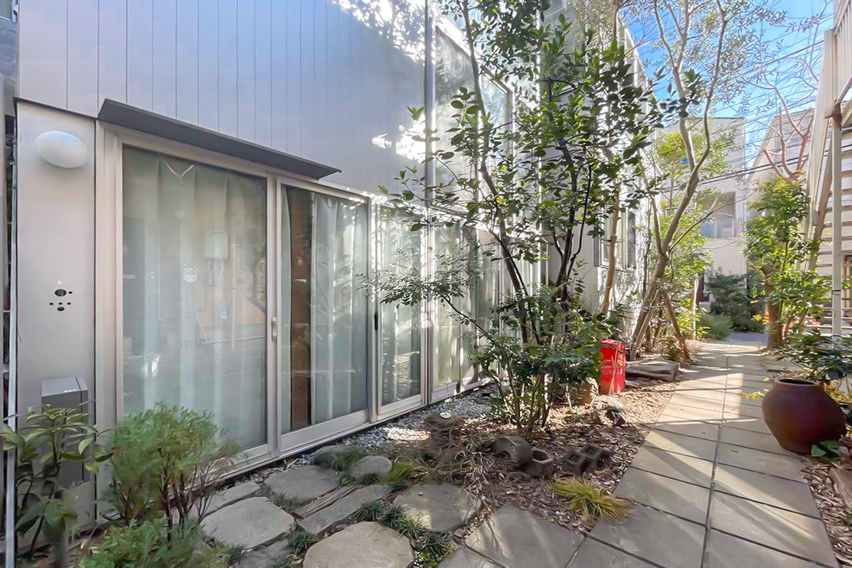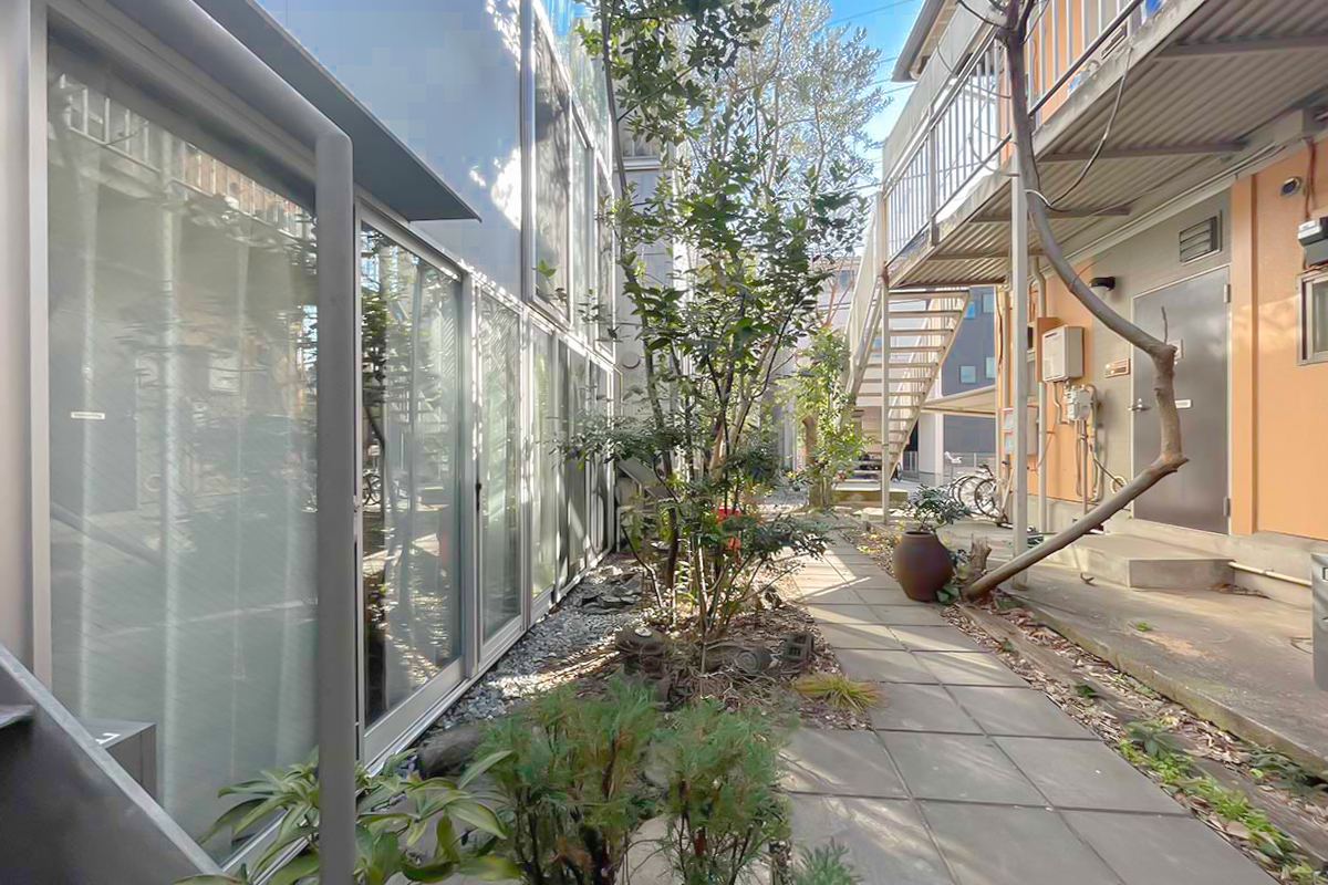 マンションまでは駅からわずか5分。住宅地の中にポッと緑に囲まれた建物が現れます。ご紹介のお部屋は建物向かって右手、緑に囲まれた共用部を抜けてお部屋にたどり着きます。