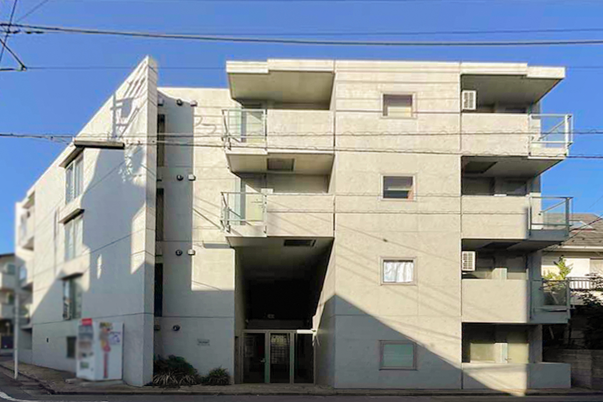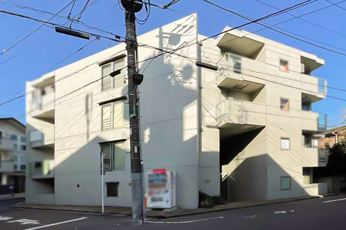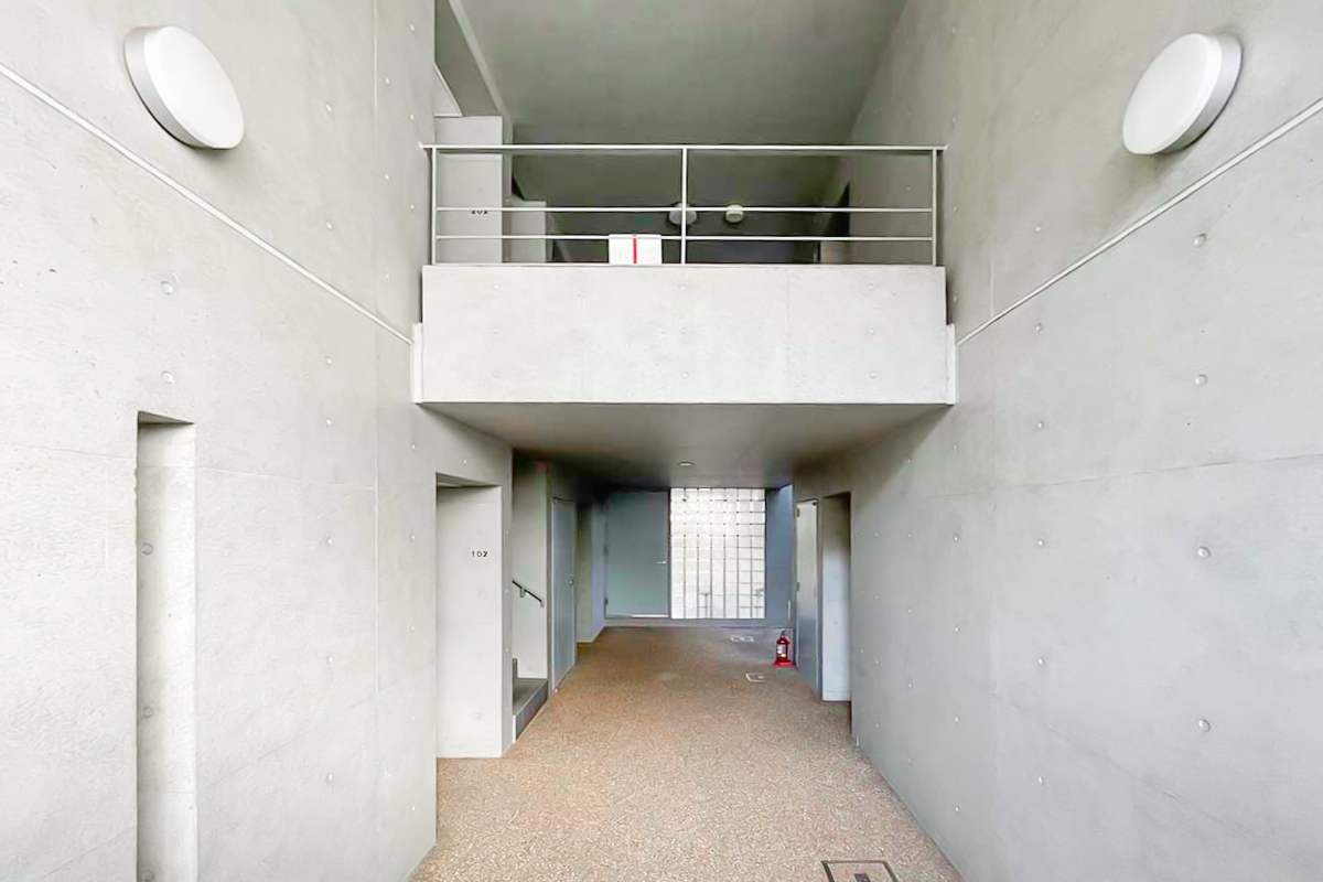 住宅地の中にポンと出てくるコンクリート打ち放しのシンプルな外観。