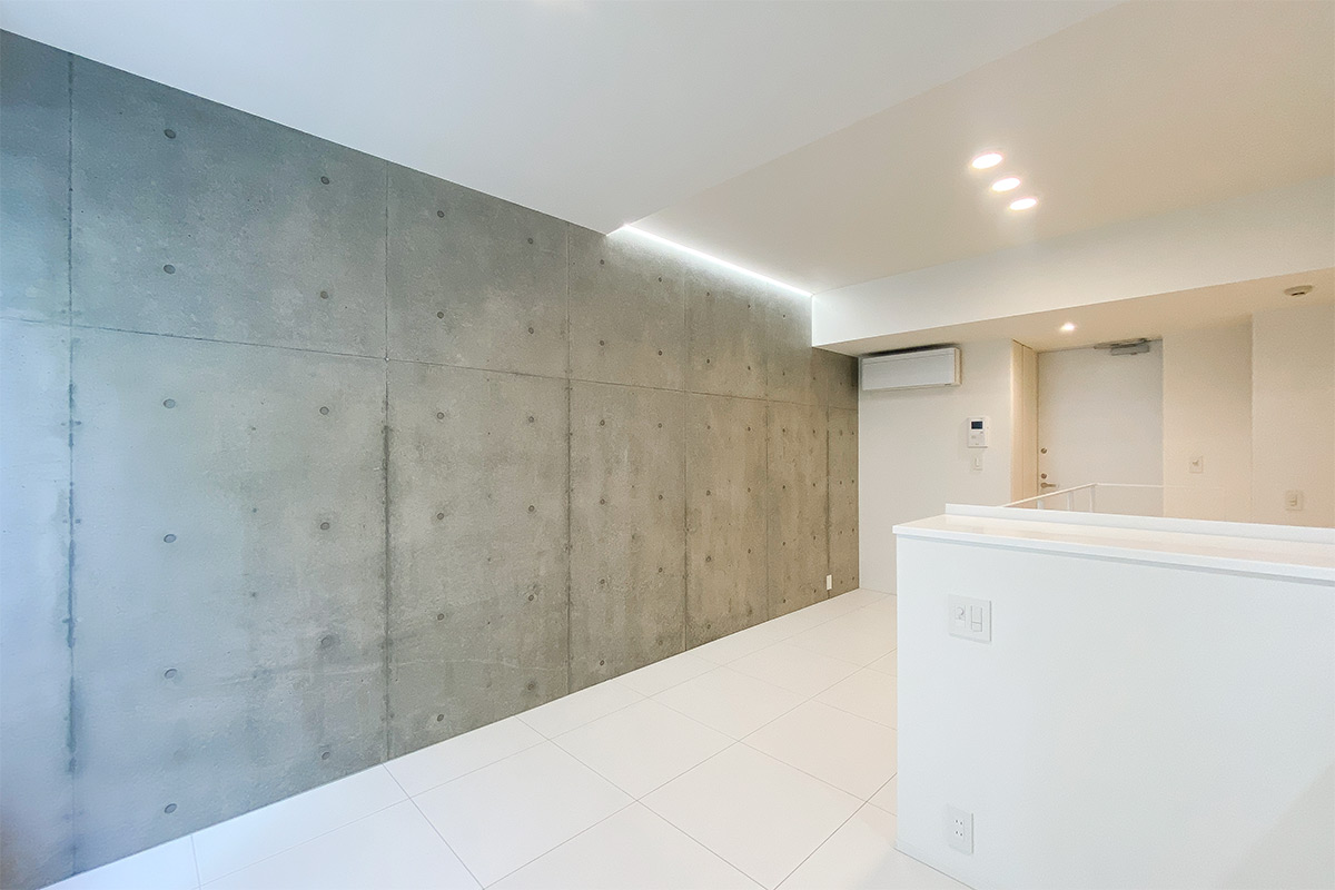 室内もコンクリート打ちっぱなしと白い壁のコンビネーションが洗練されたデザイナーズの仕上がり。