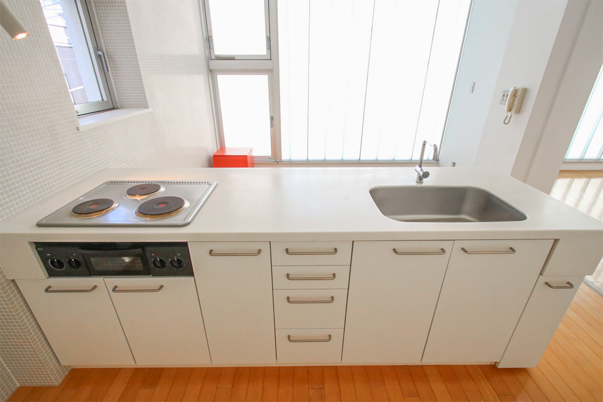 白×一部グレータイルがどことなくモダンなキッチンはプレートヒータータイプの3口コンロ。