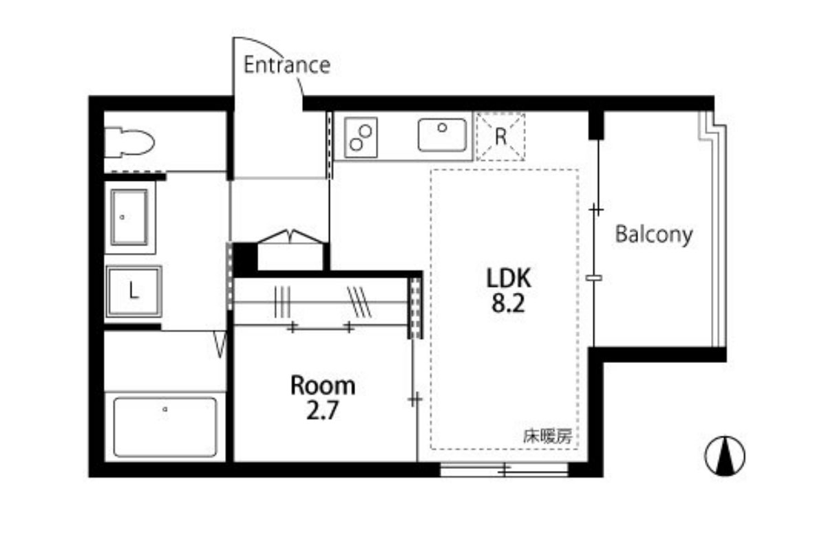 室内は約30㎡の1LDK、8帖リビングは床暖房付き。
