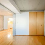 居室の壁は片面がコンクリート打ちっぱなし、向かい側の壁は白いタイル。