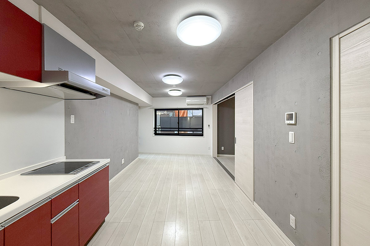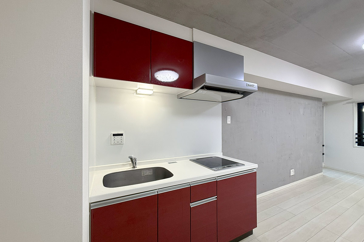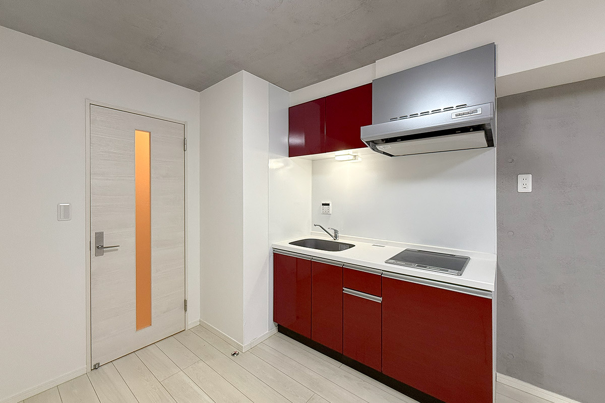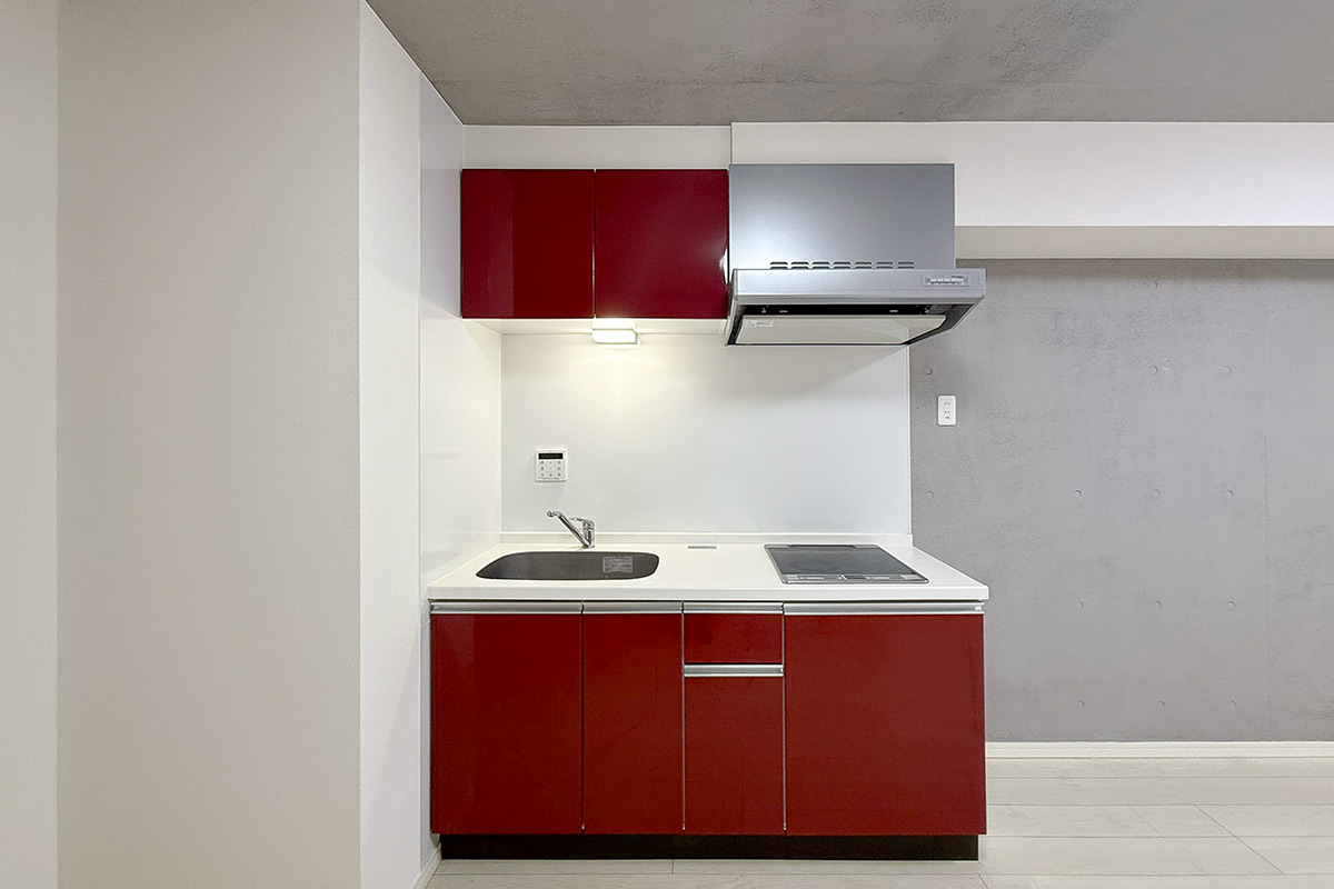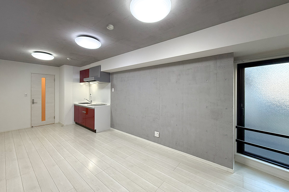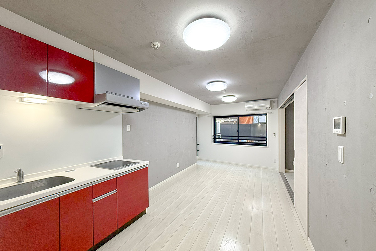 室内はコンクリートとアクセントカラーの赤をあしらった、シックなデザイナーズ仕様。