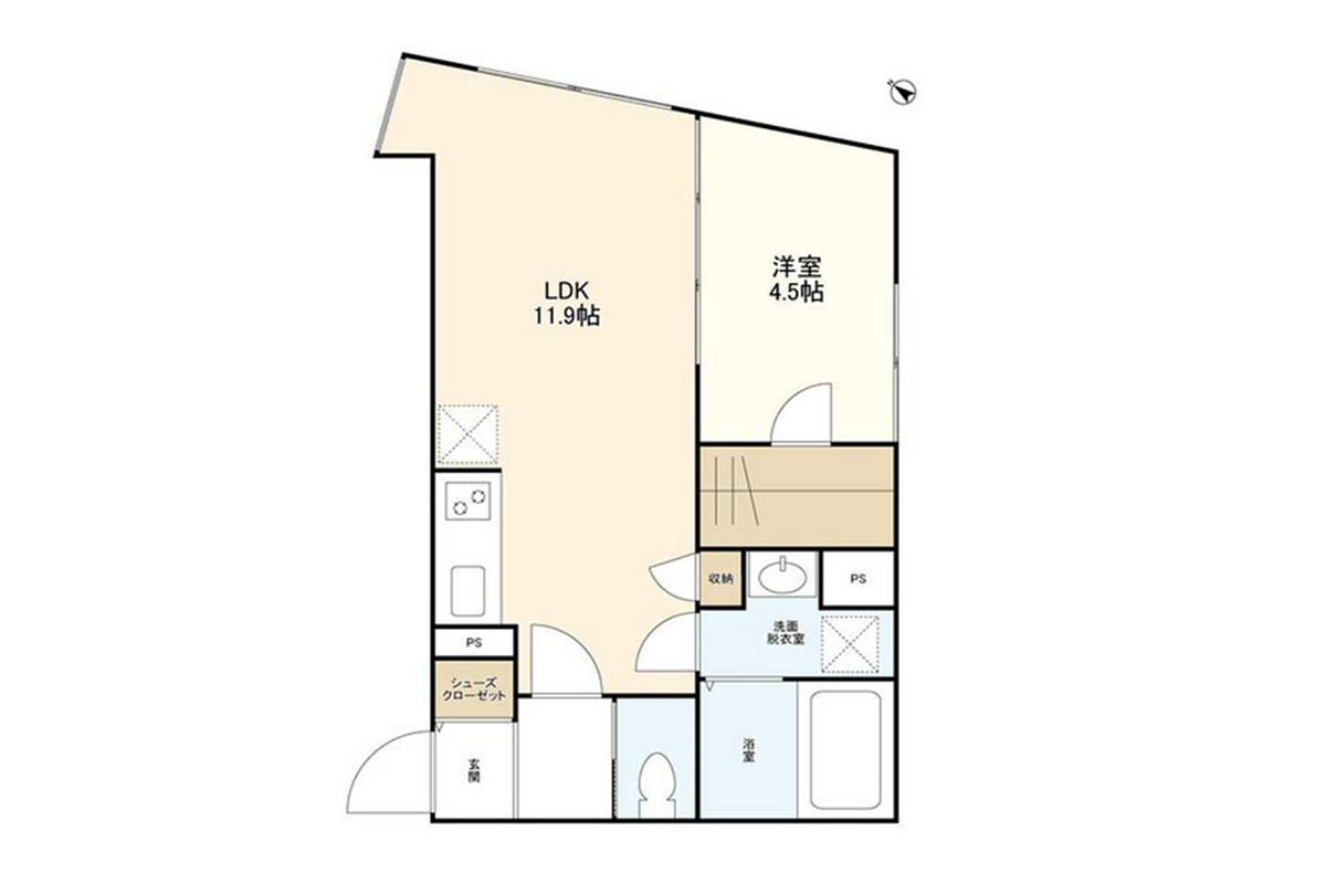こちらのお部屋は1階の角部屋、約40㎡の1LDKタイプ。