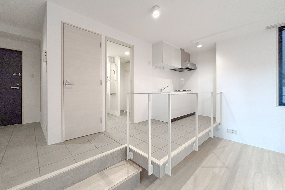 洋室とリビングダイニングは扉がなく、ステップを介してゆるやかに区切られ、ワンルーム感覚でも使えそう!