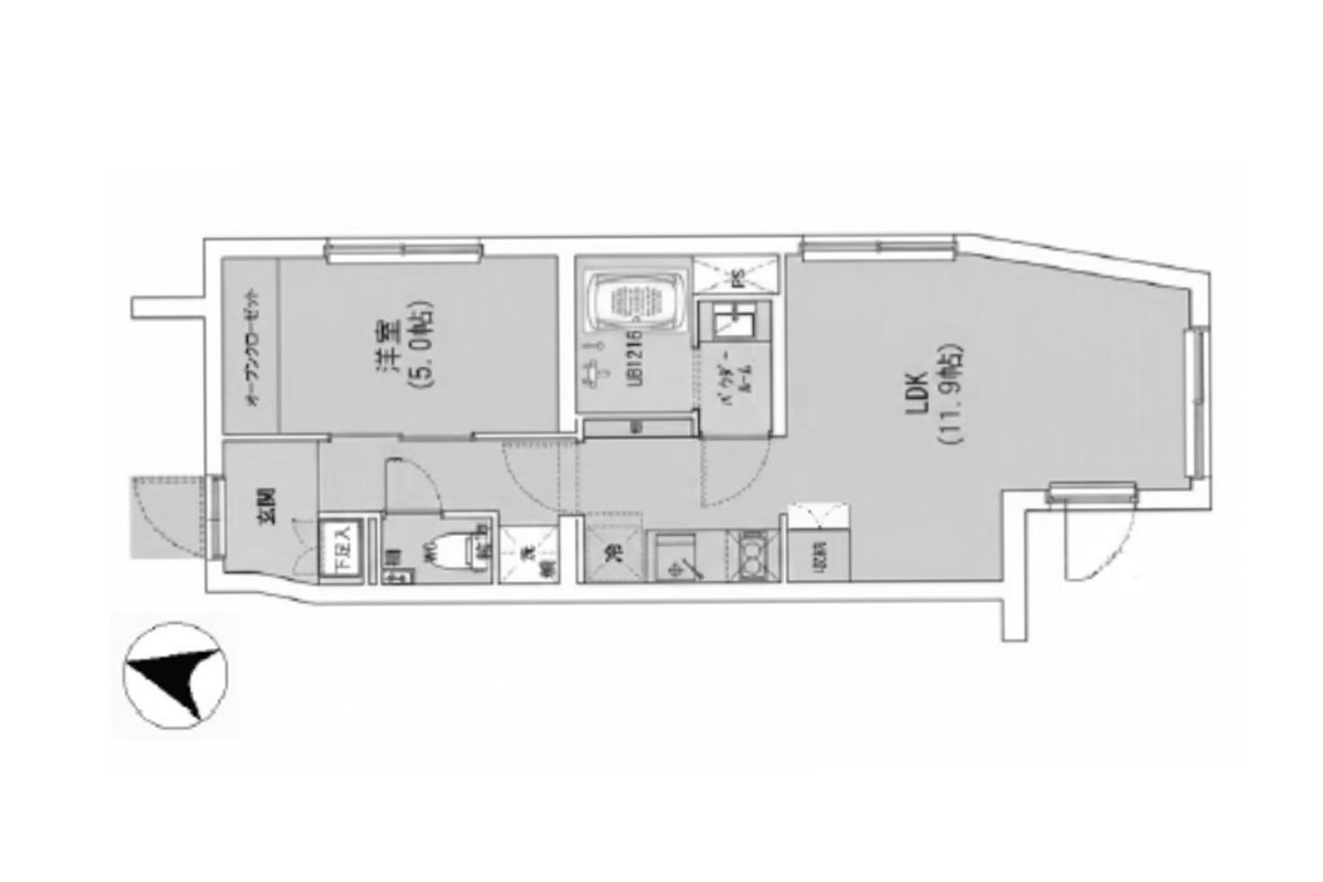 約12帖のリビングは五角形のような形状、棚収納横のくぼみ部分に作業スペースやプラスの収納等を配置すればリビングの動線もすっきりしそう。