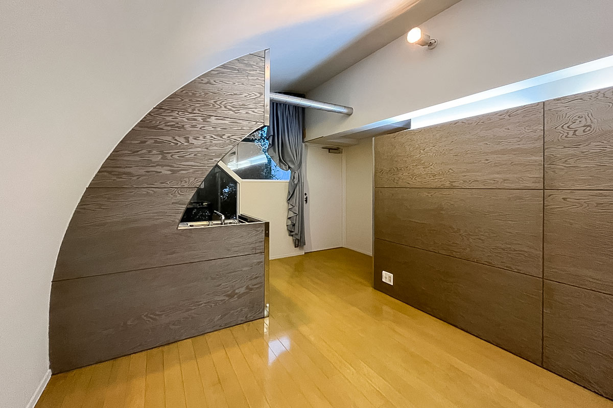 そして室内はシンプルながらも中々見ない扇形の空間。窓の形に沿って降りていくカーテンも新鮮です。奥のキッチンに立つと反射する空間に包まれるので、まるで宇宙船の中にいるような気持ちになるかも。バルコニーは2か所についています。