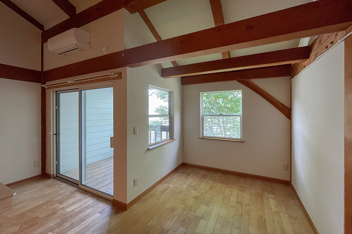 ドアを開けると、木材の香りがふわっと迎えてくれました。大きなティンバーフレームが施された室内は広々と15帖。天井も高く気持ちの良い空間です。