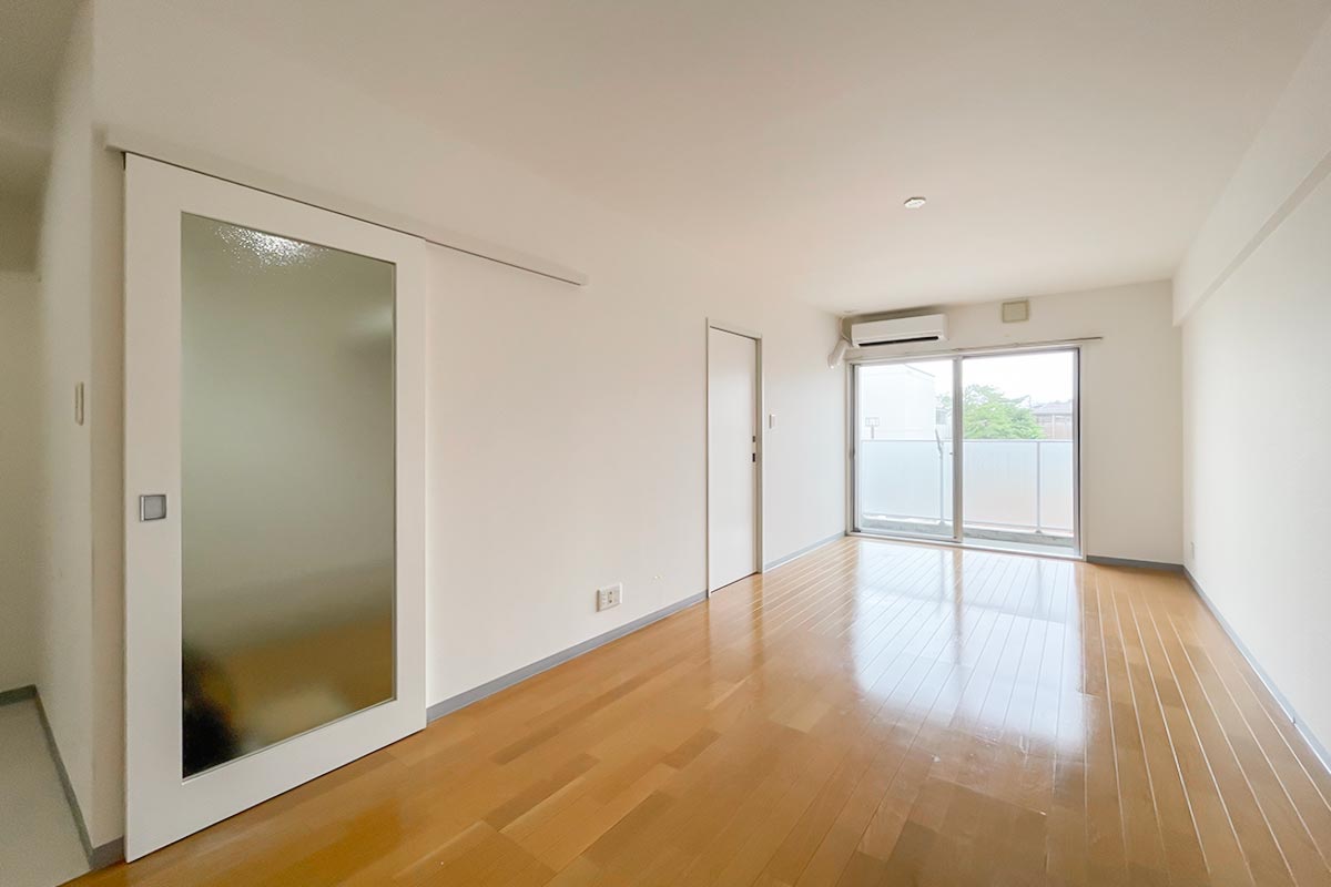 キッチン側にはダイニングテーブルを置き、バルコニー側にはベッドやソファが配置できそう。