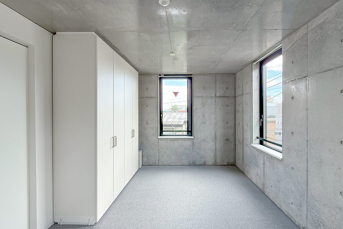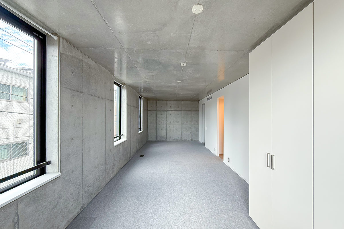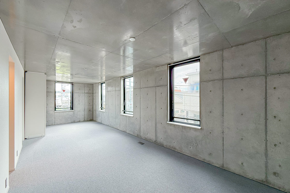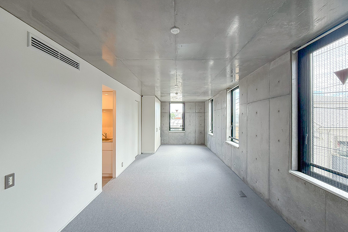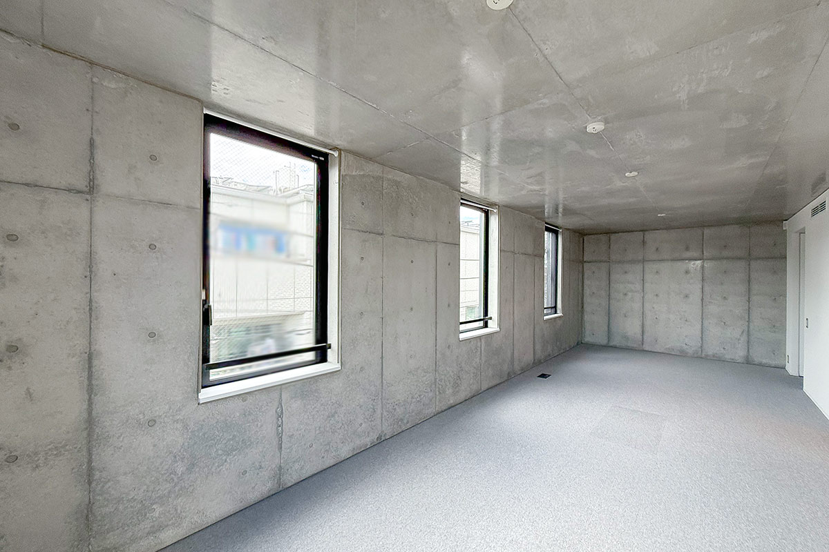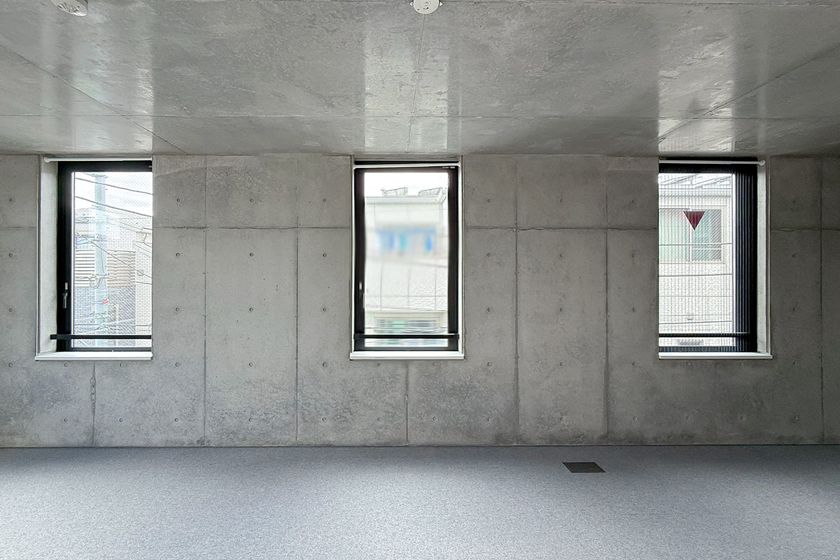 グレーの床にコンクリートの壁、縦長の窓が規則正しくアートのように並びます。