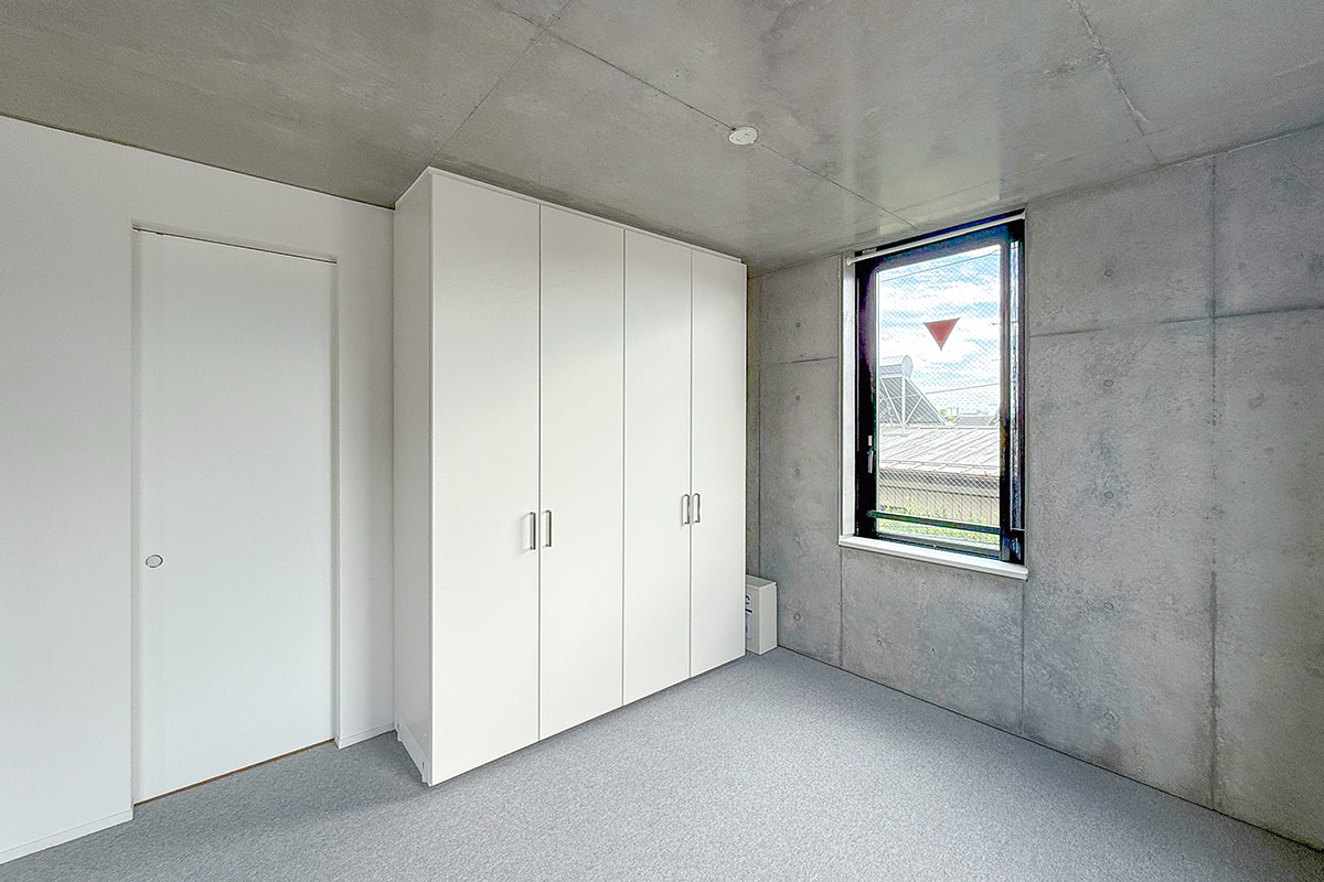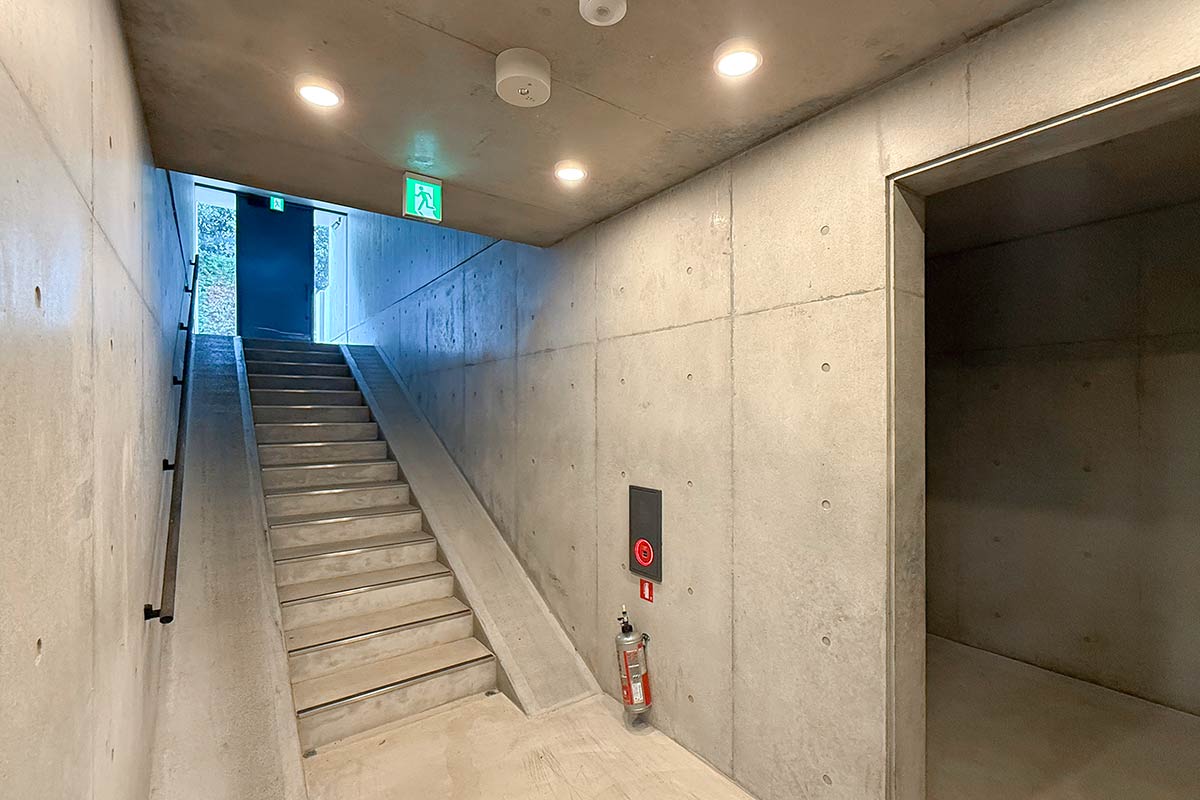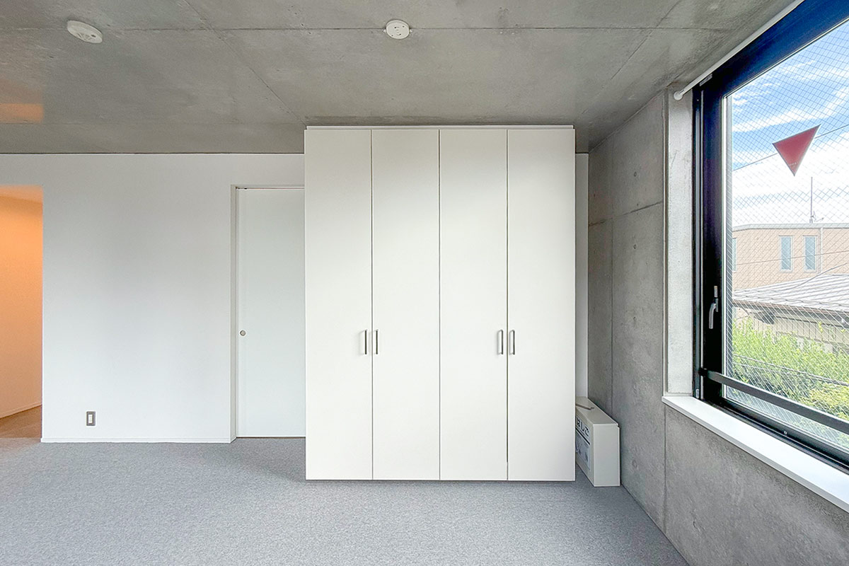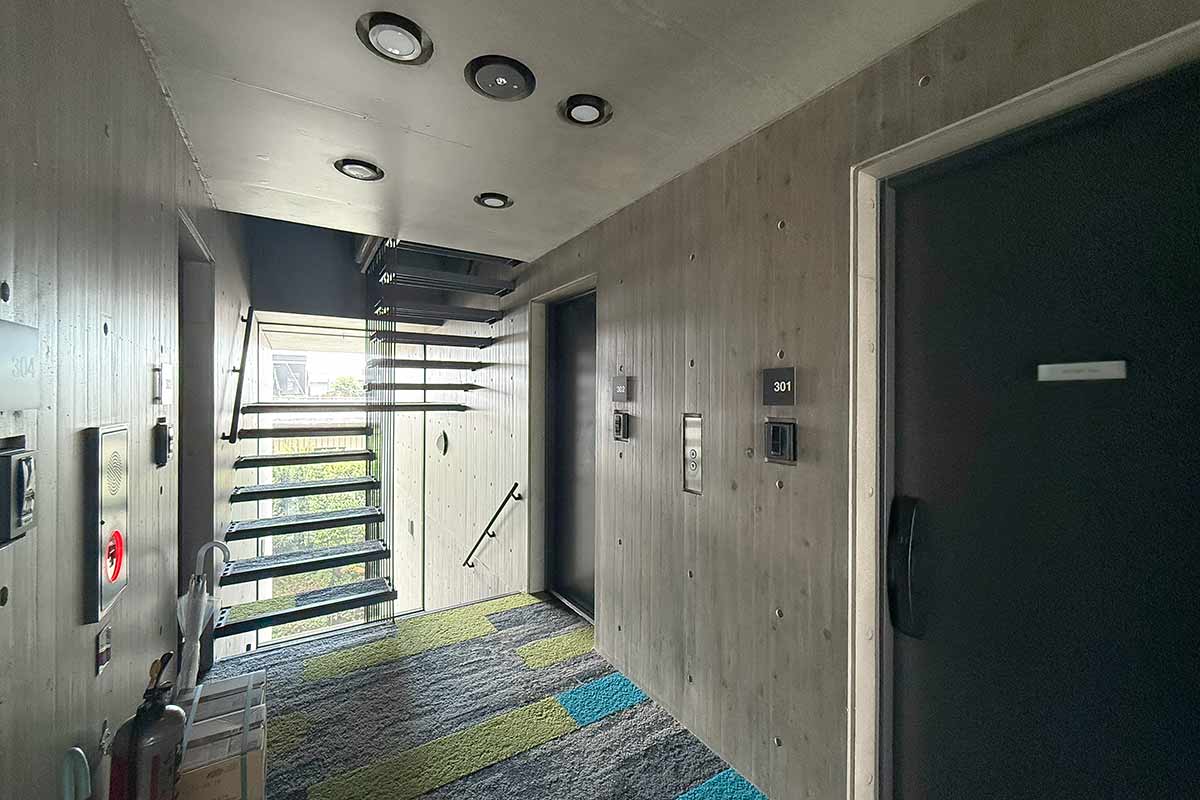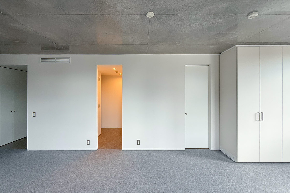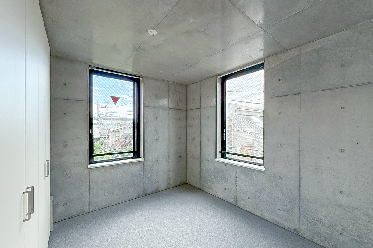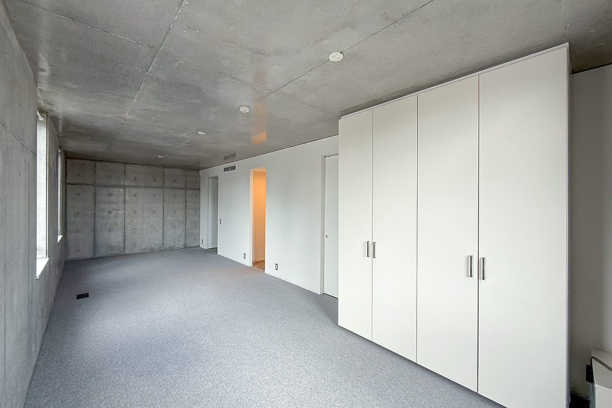 グレーの床にコンクリートの壁、縦長の窓が規則正しくアートのように並びます。