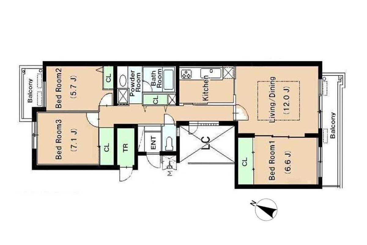 12帖のリビングと隣接する6.6帖の洋室、廊下を挟んで反対側に7.1帖と5.7帖の洋室のある間取り。