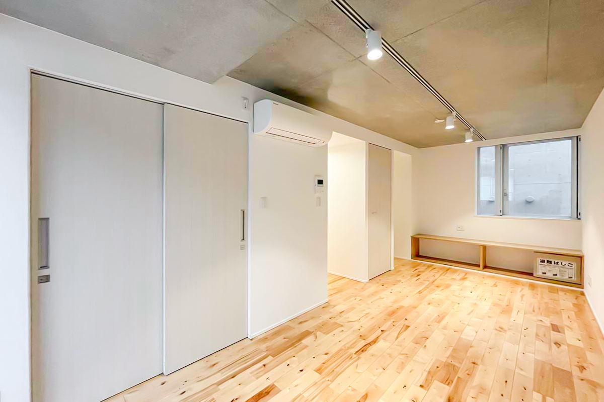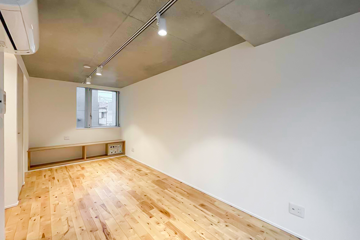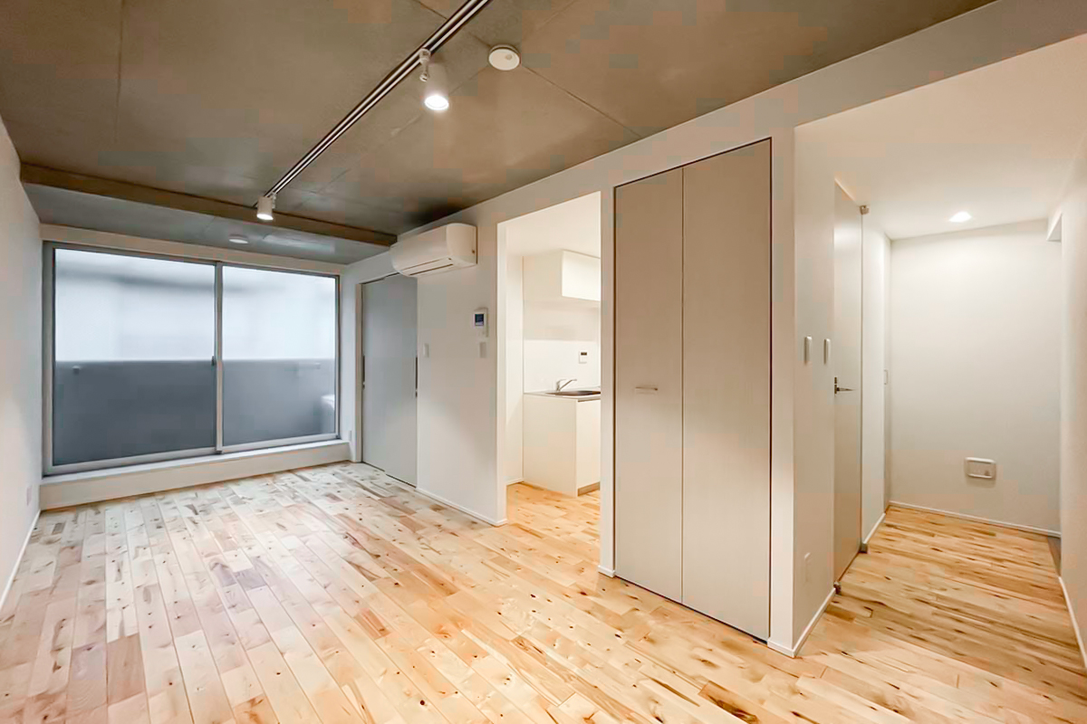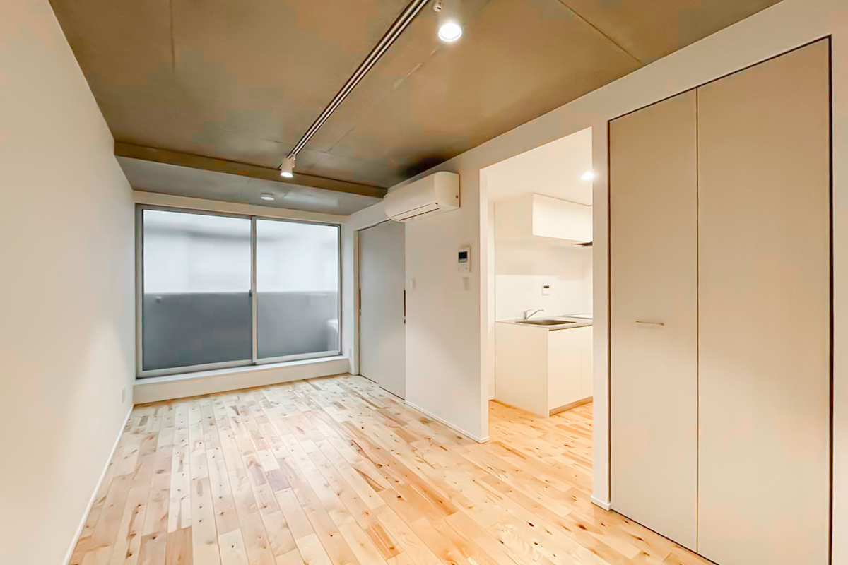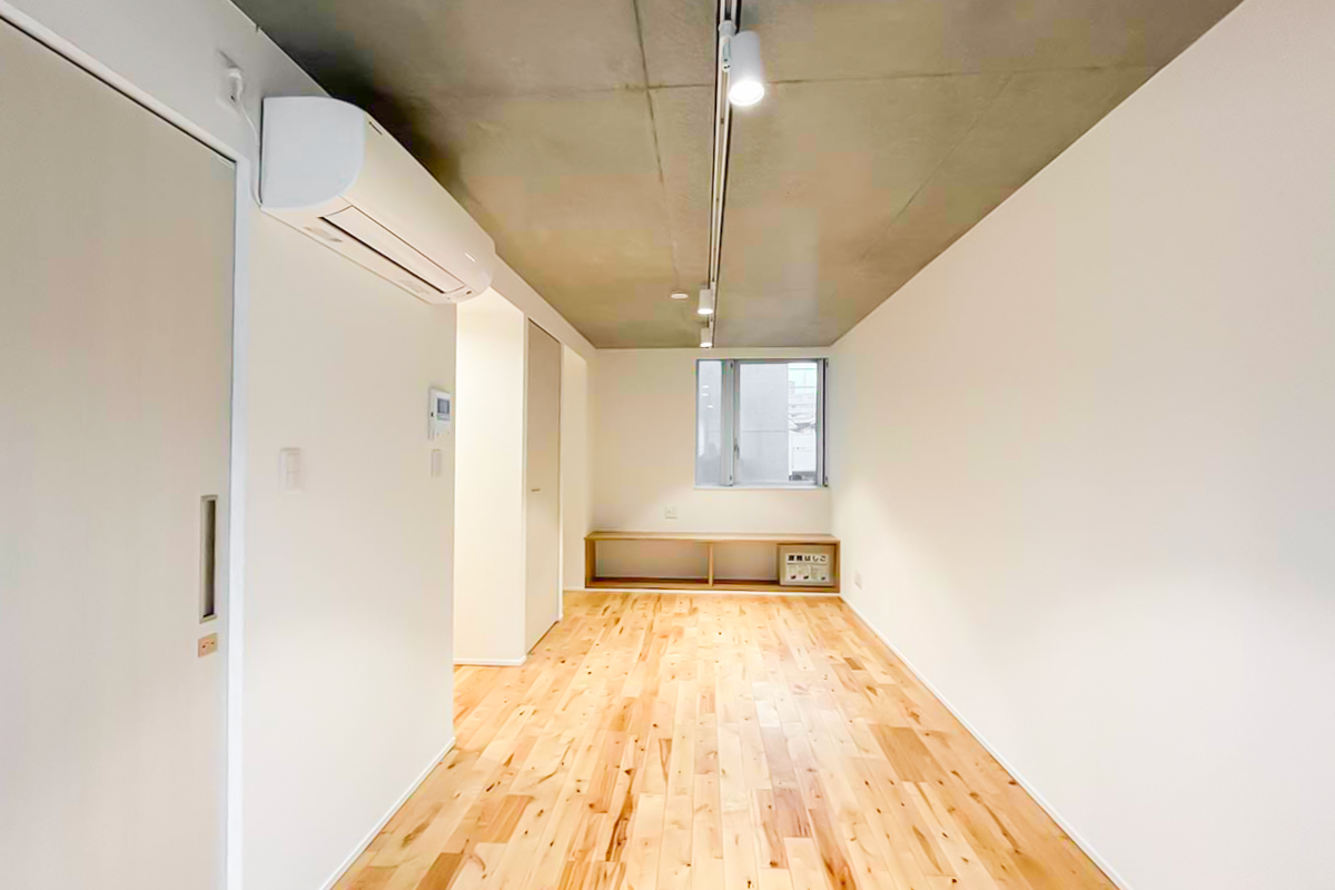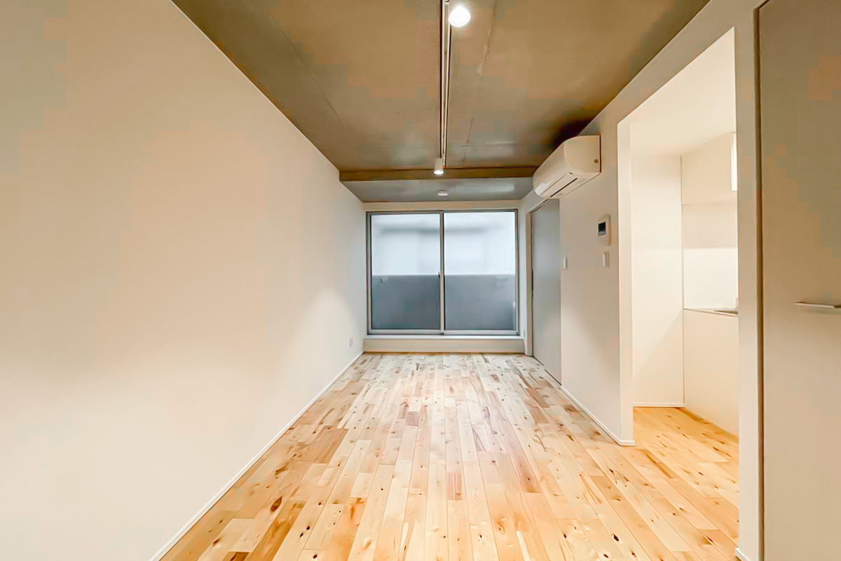 床は無垢床で風抜けや陽射しにも期待ができ、一般的なワンルームに比べて温かみあり、開放的な空間です。