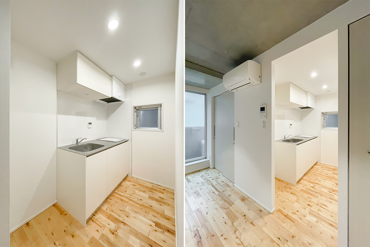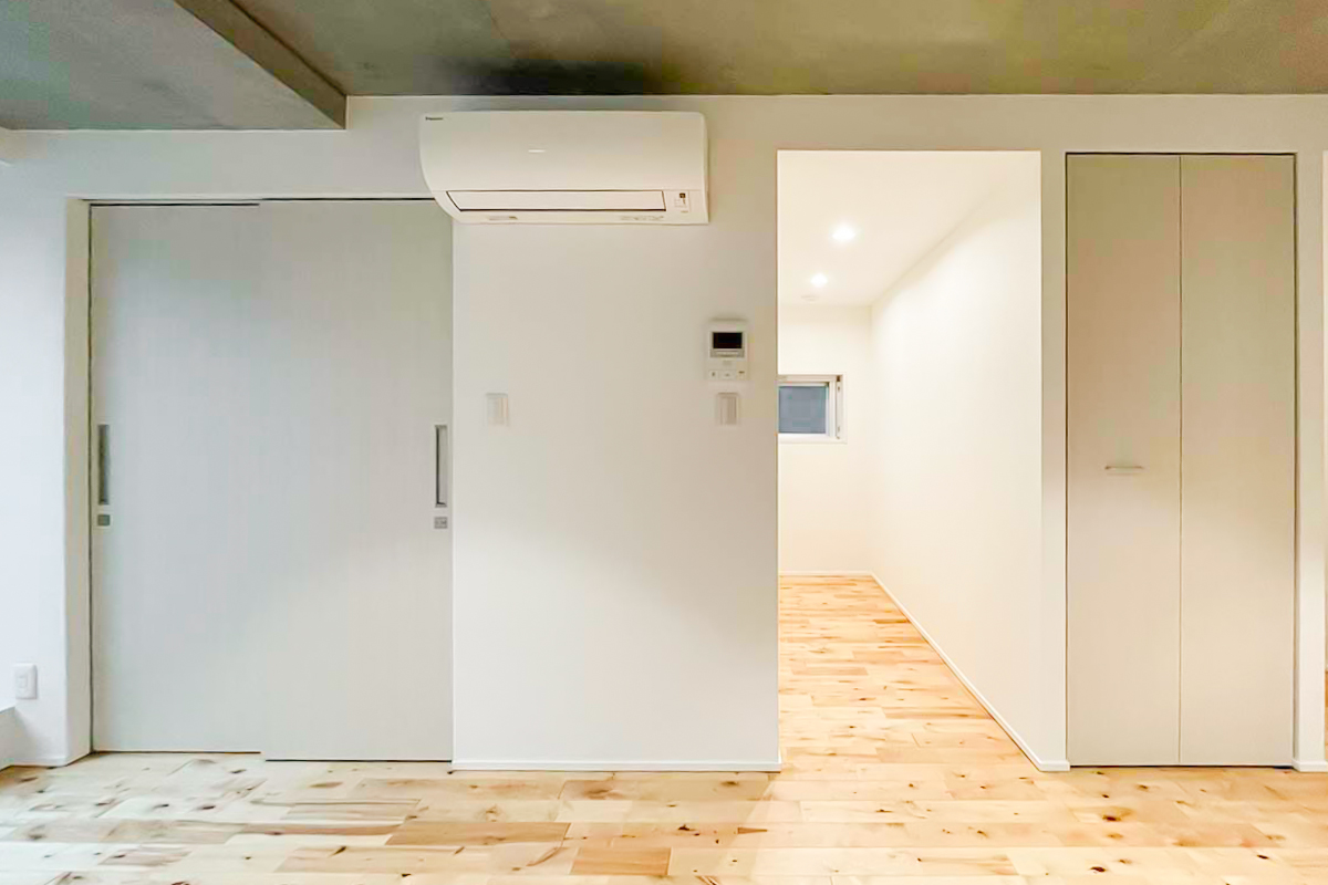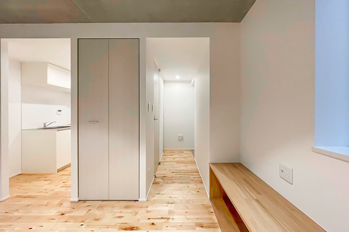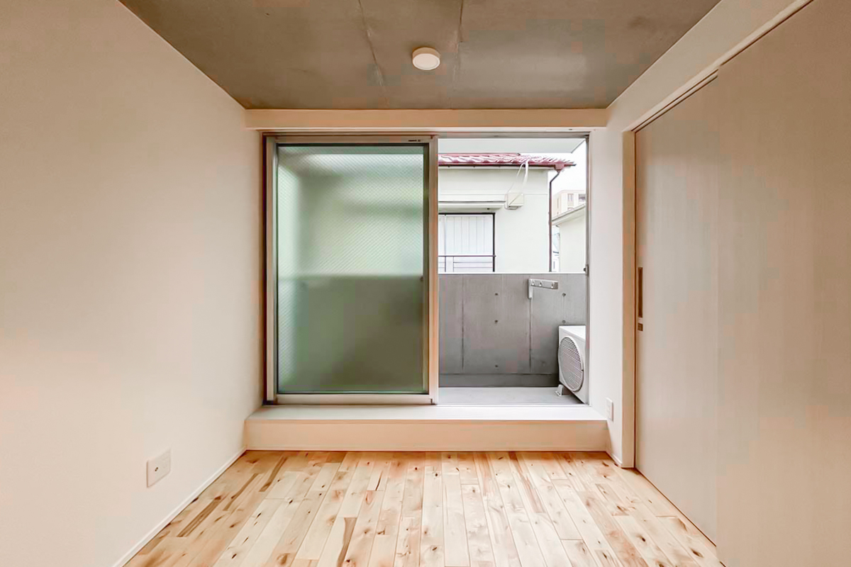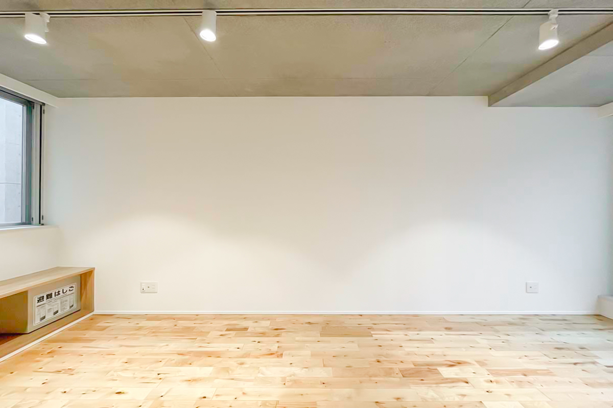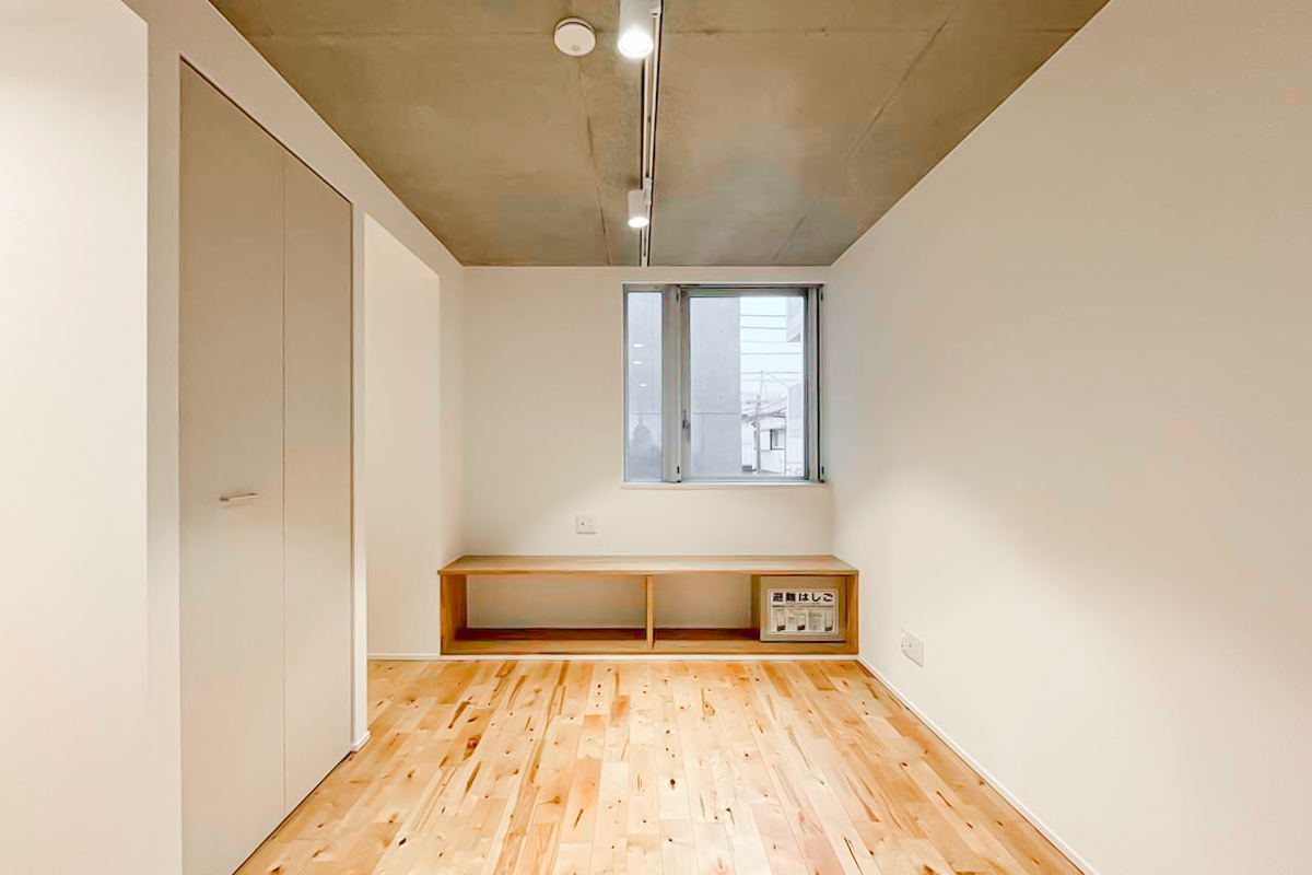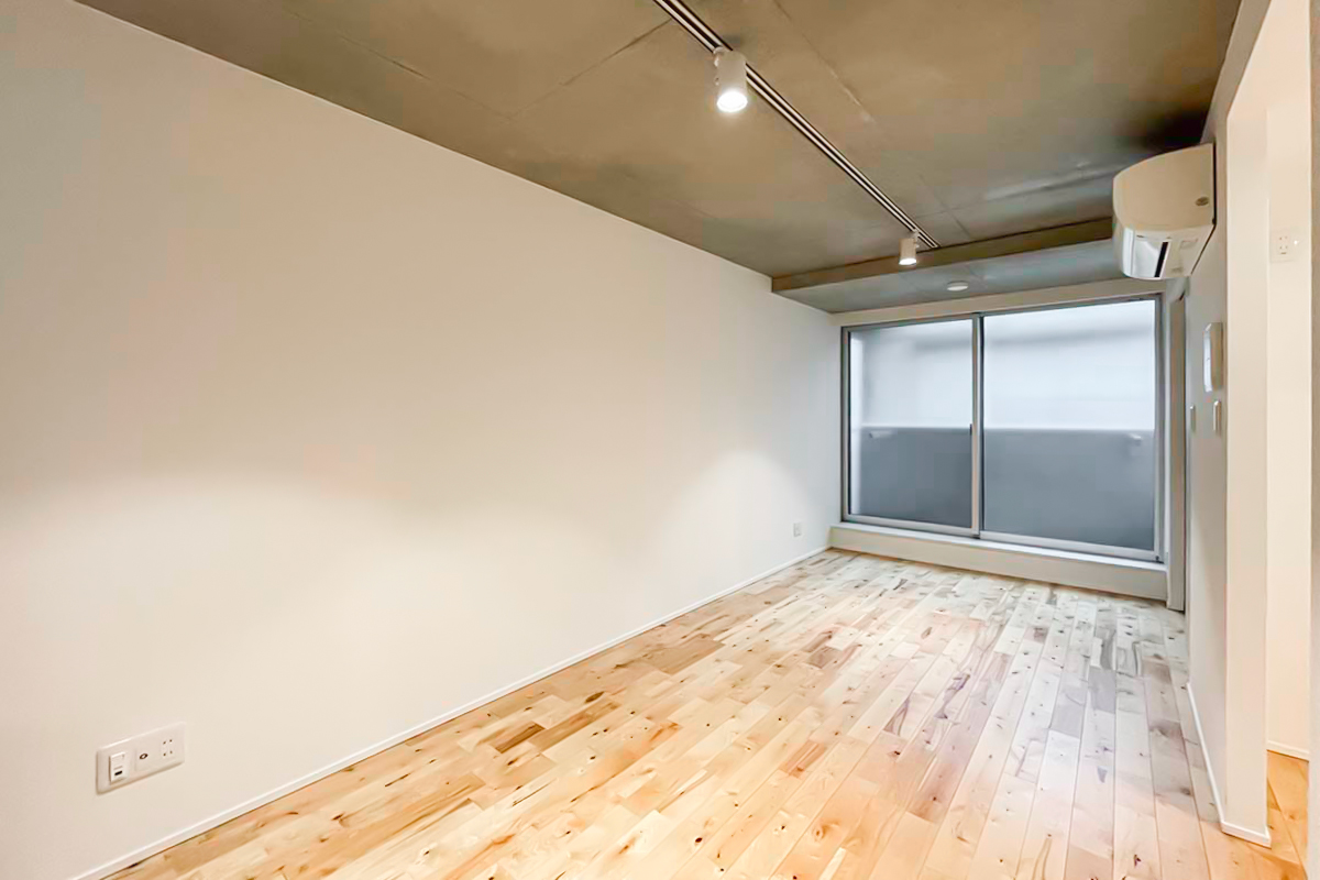 床は無垢床で風抜けや陽射しにも期待ができ、一般的なワンルームに比べて温かみあり、開放的な空間です。