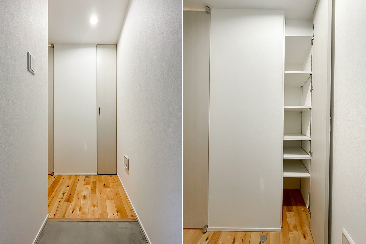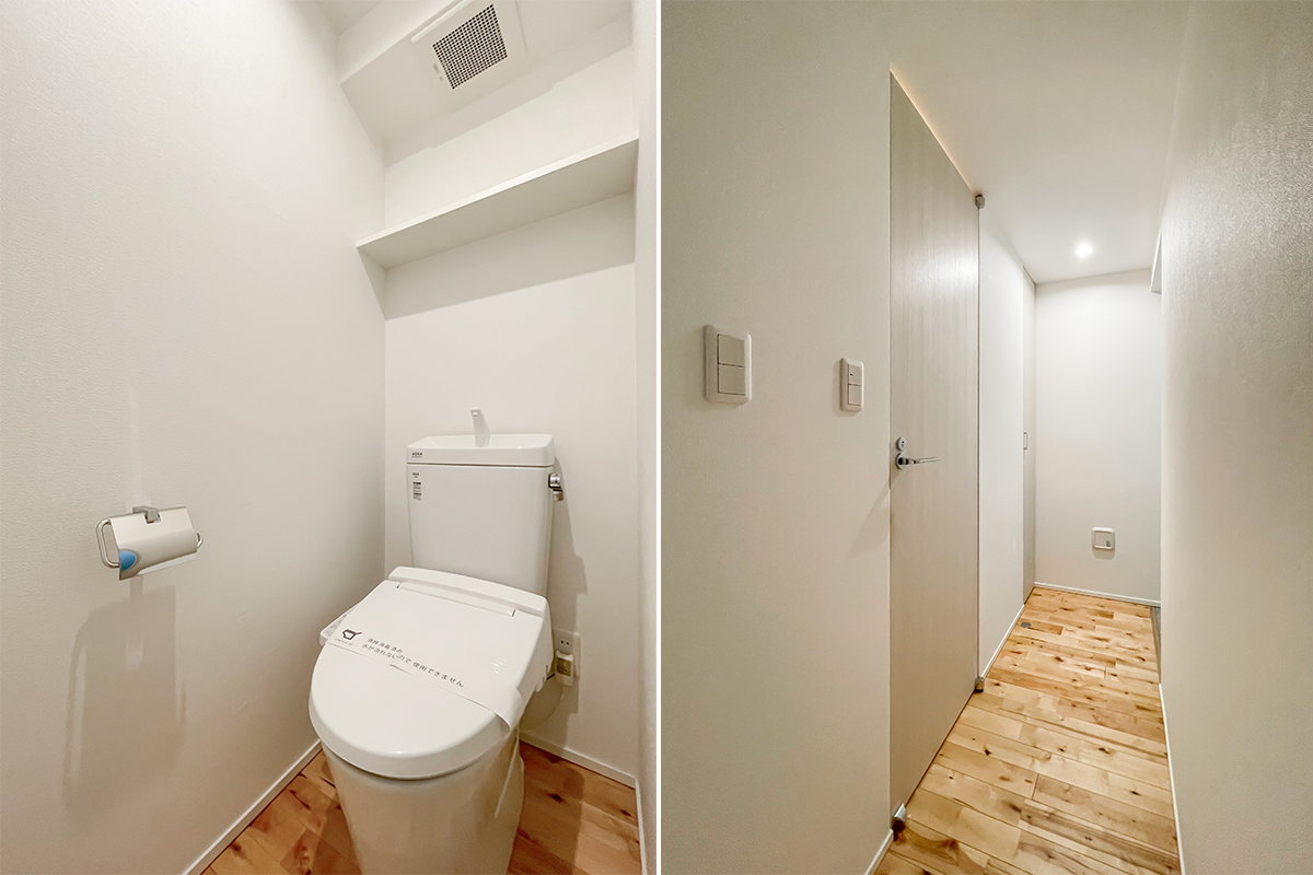 玄関開けてすぐに部屋全体がパッと見えてしまう心配もない形で、トイレは玄関近くに配置され、洗面脱衣所とは別。