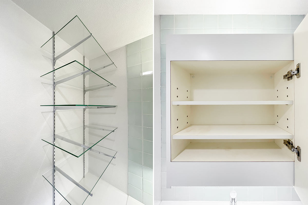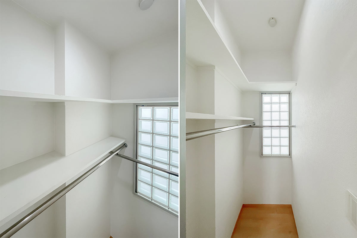 ウォークインクローゼットは、上部の棚が2段構えで収納力あり!ウォークインクローゼットの中にもガラスブロックがあり明るいクローゼットでした。