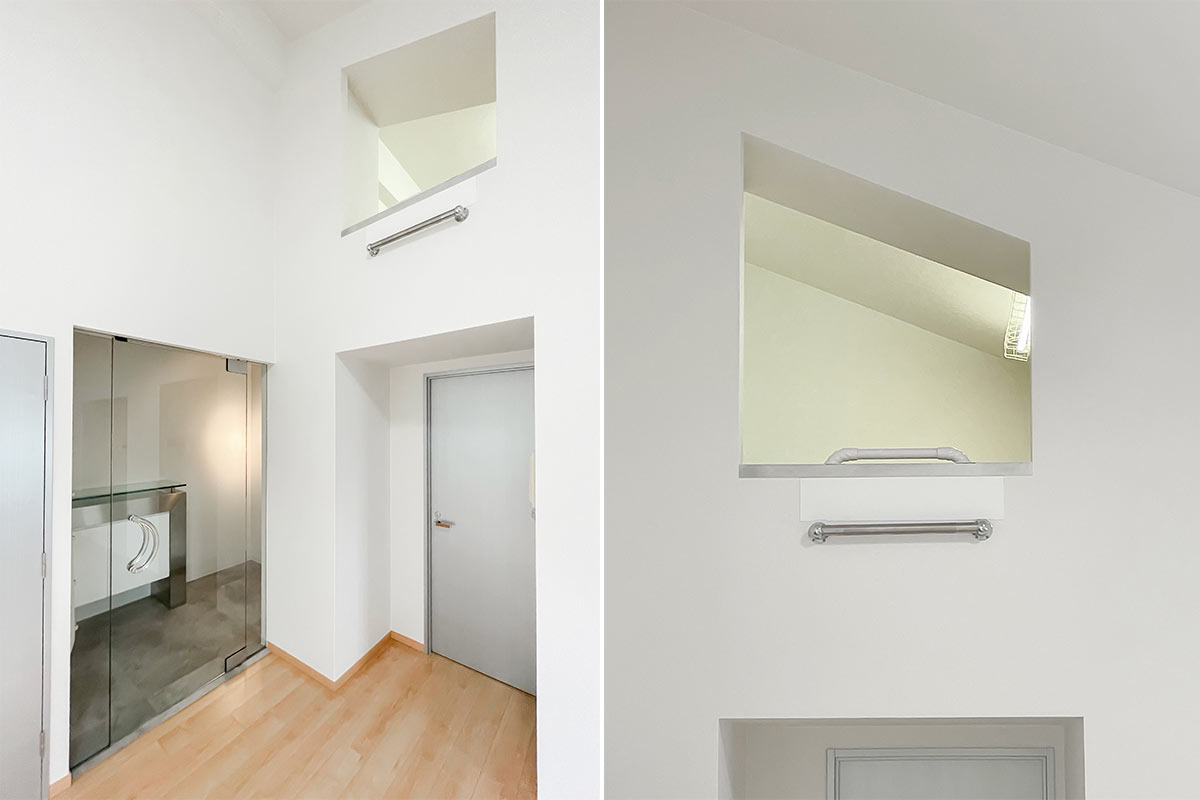 エントランスから数段階段を登った先の部屋であること、地下1階の部屋のために大きな吹き抜け・ドライエリアが作られているからか、1階感が軽減されています。